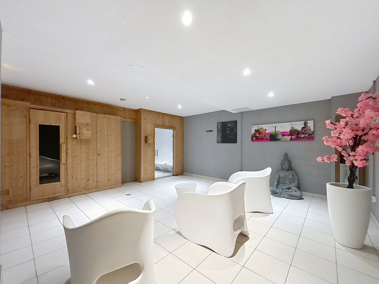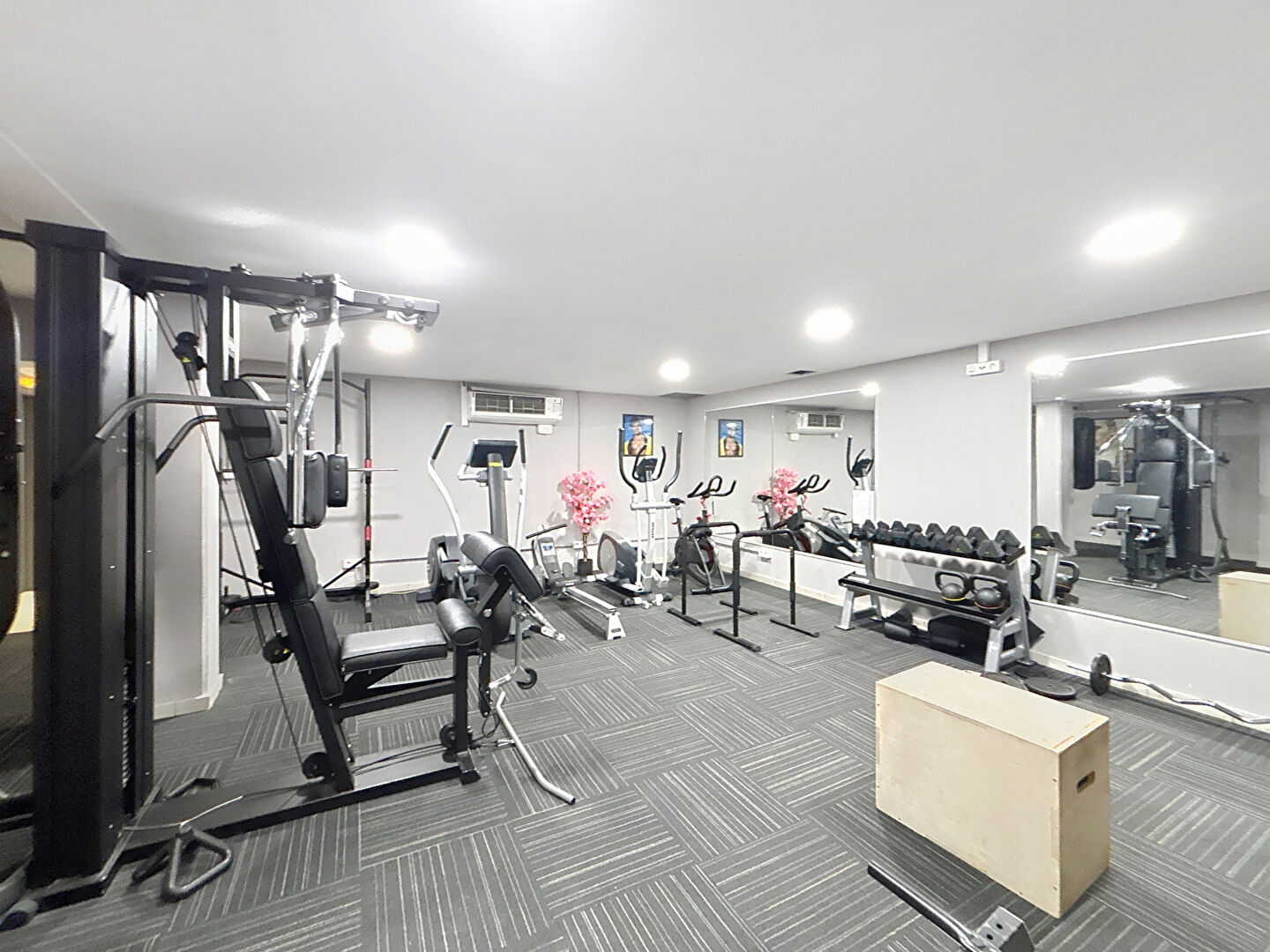 piscine, sauna, salle de fitness, laverie et cafeteria en journée.
