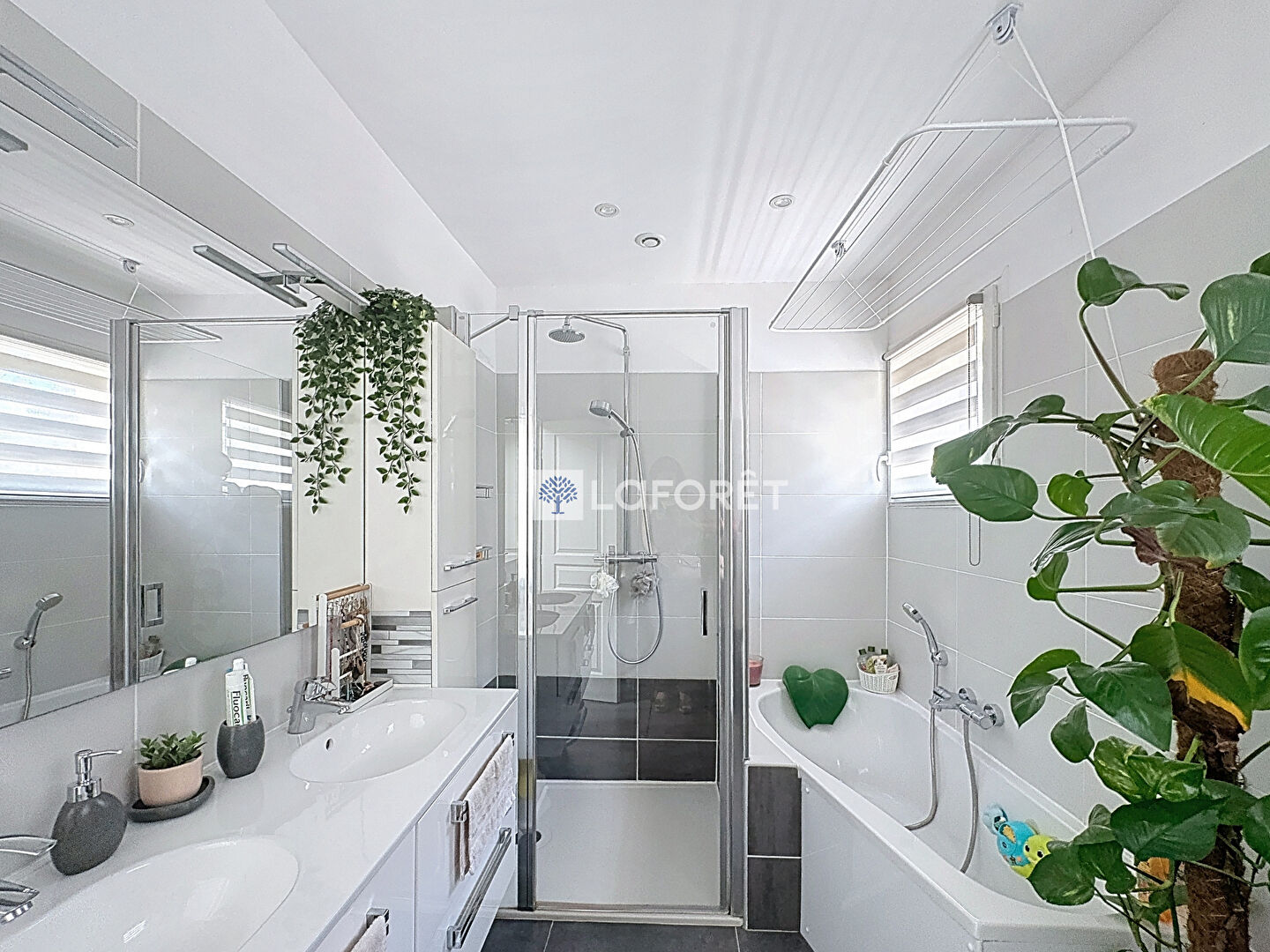 A l'étage : 2 chambres avec placards, une grande salle de bain avec wc, une buanderie.