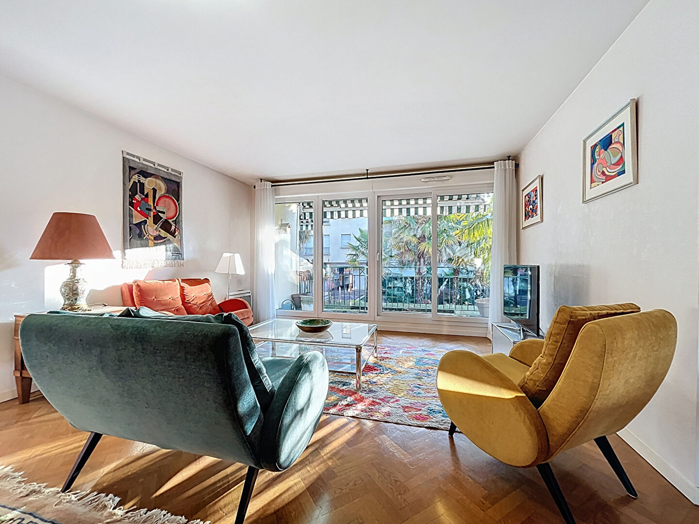 Cet appartement traversant bénéficie d'un double séjour lumineux orienté plein sud, donnant accès à un balcon avec vue sur les jardins de la résidence.