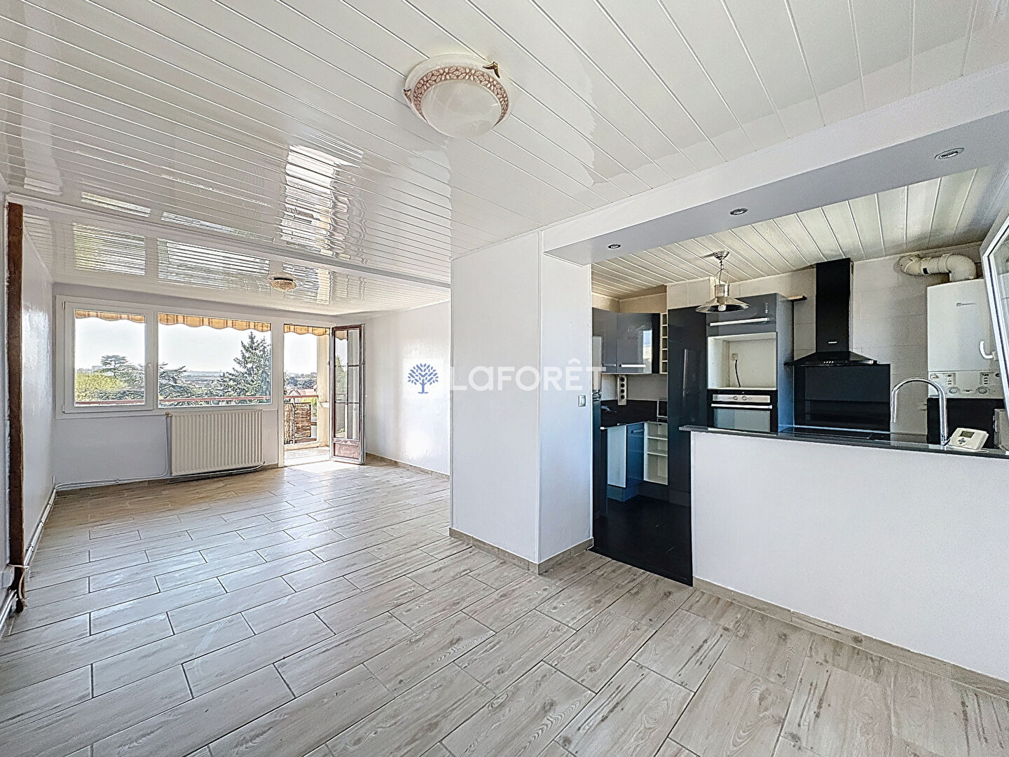 bel espace de vie donnant sur balcon, cuisine ouverte entièrement aménagée et équipée, deux chambres, salle de bains.