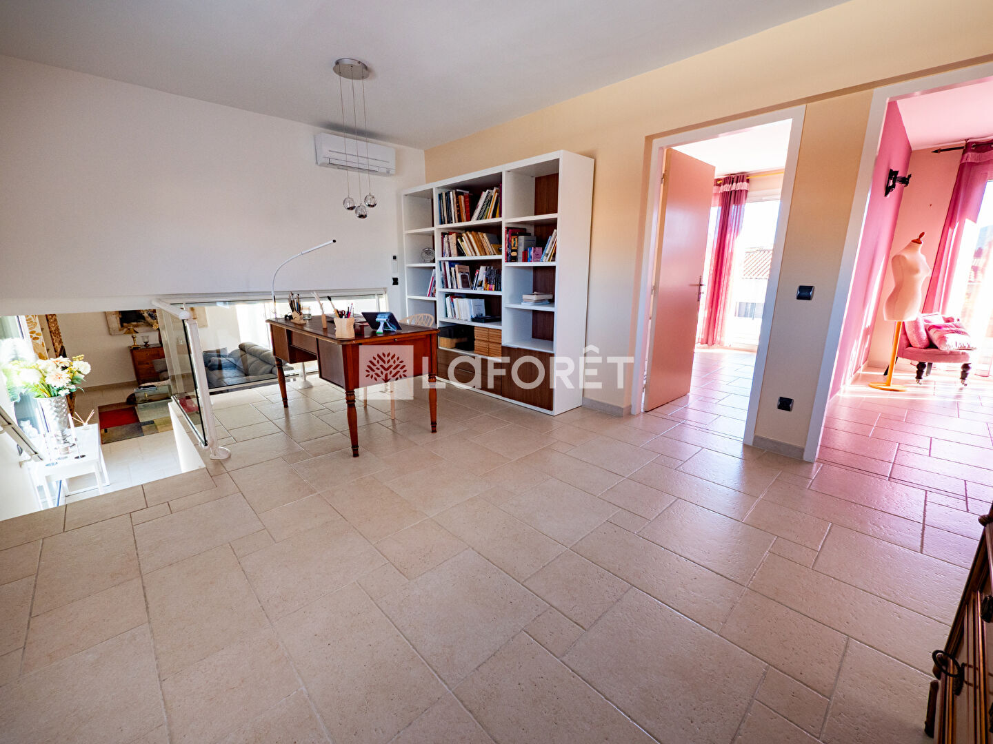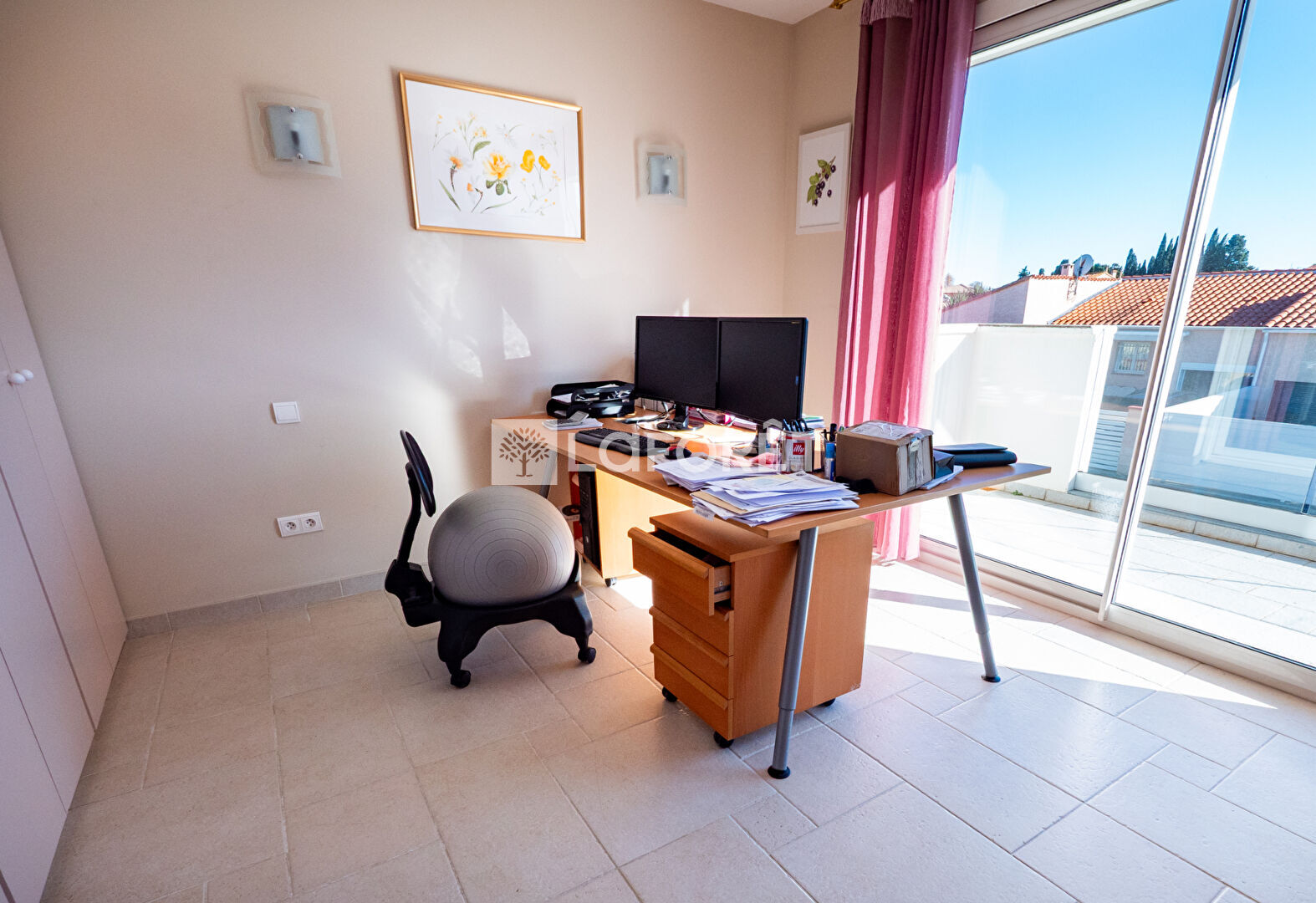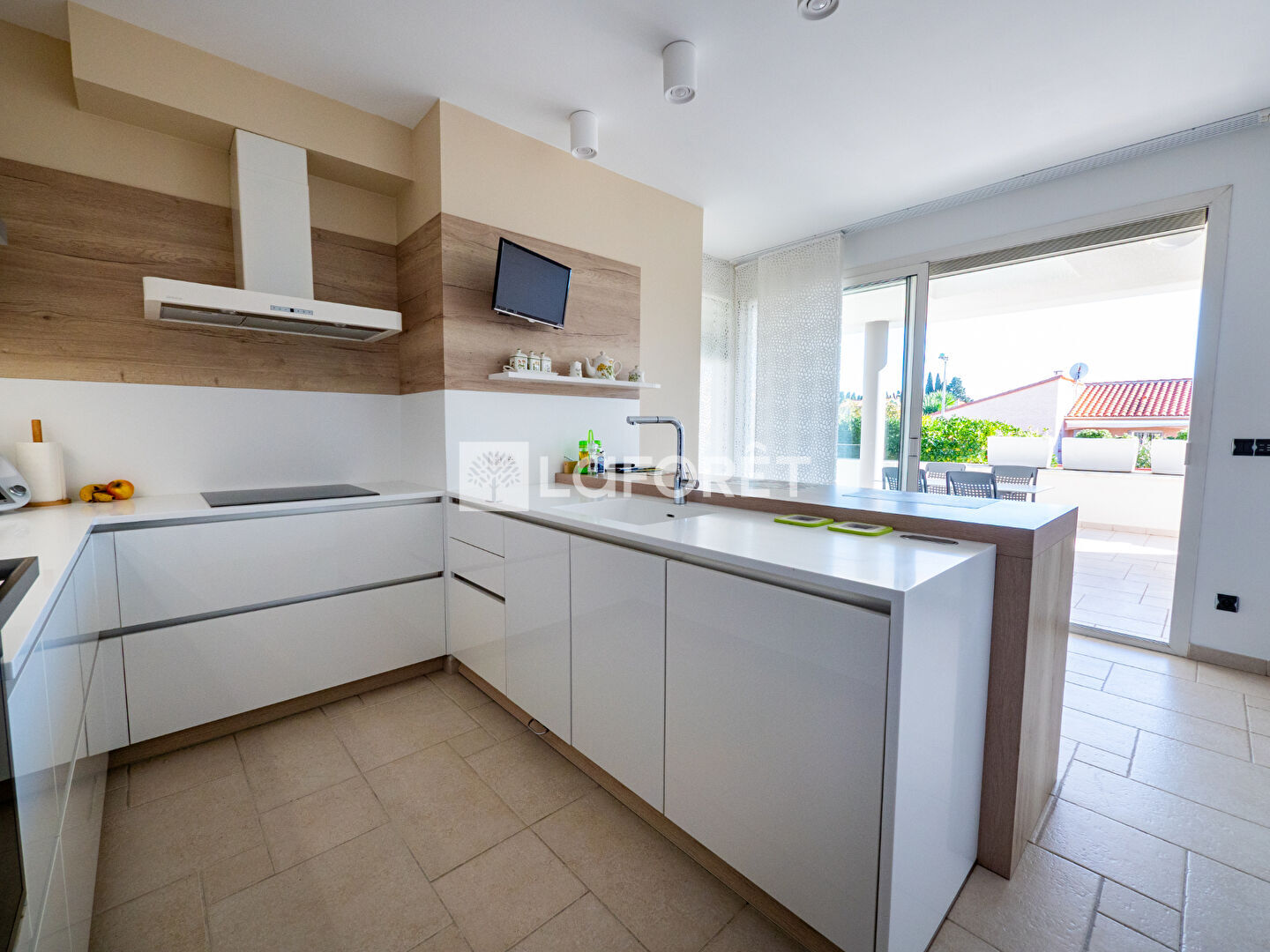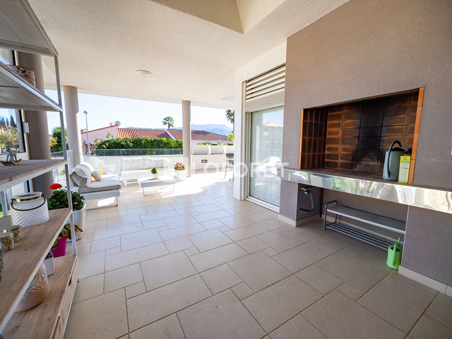 L'espace jour offre un grand salon salle à manger lumineux avec insert et une belle hauteur sous plafond, ainsi qu'une cuisine moderne et fonctionnelle accompagnée de son arrière-cuisine. L'ensemble s'ouvre sur une vaste terrasse avec une superbe vue dégagée sur les Albères, idéale pour profiter de chaque saison.