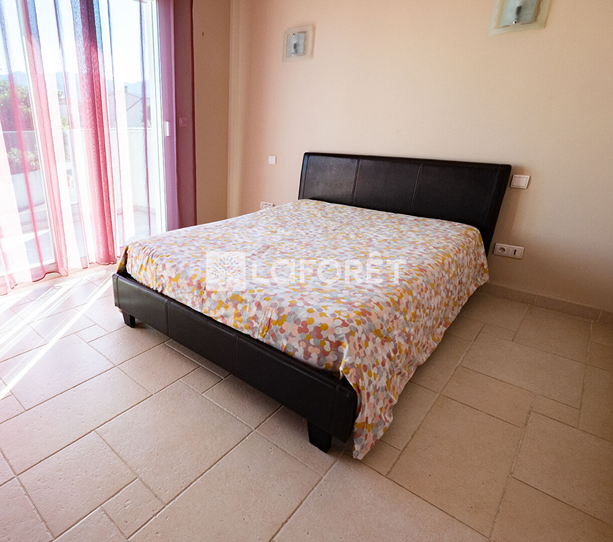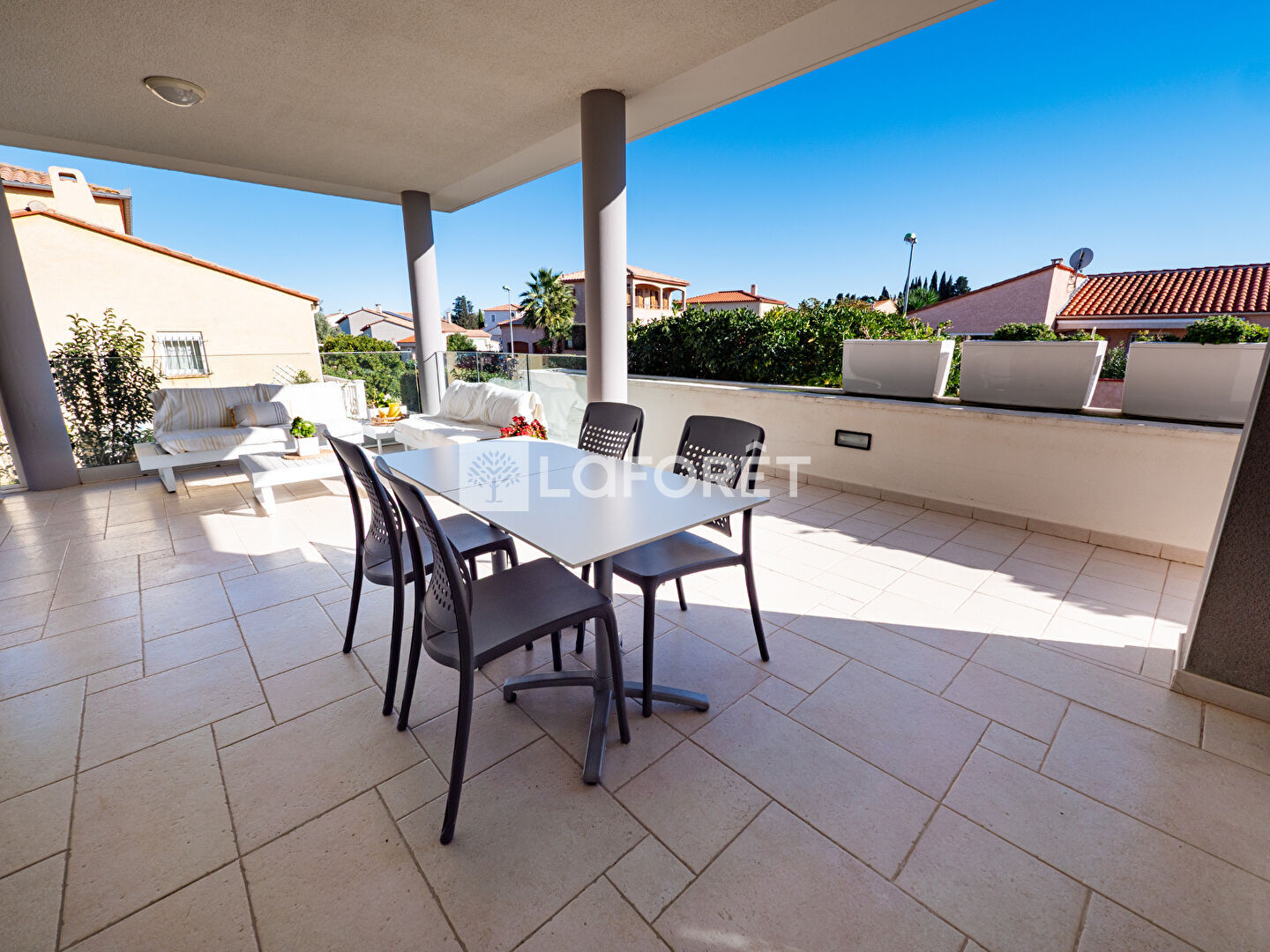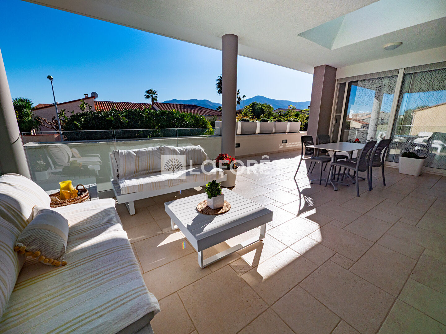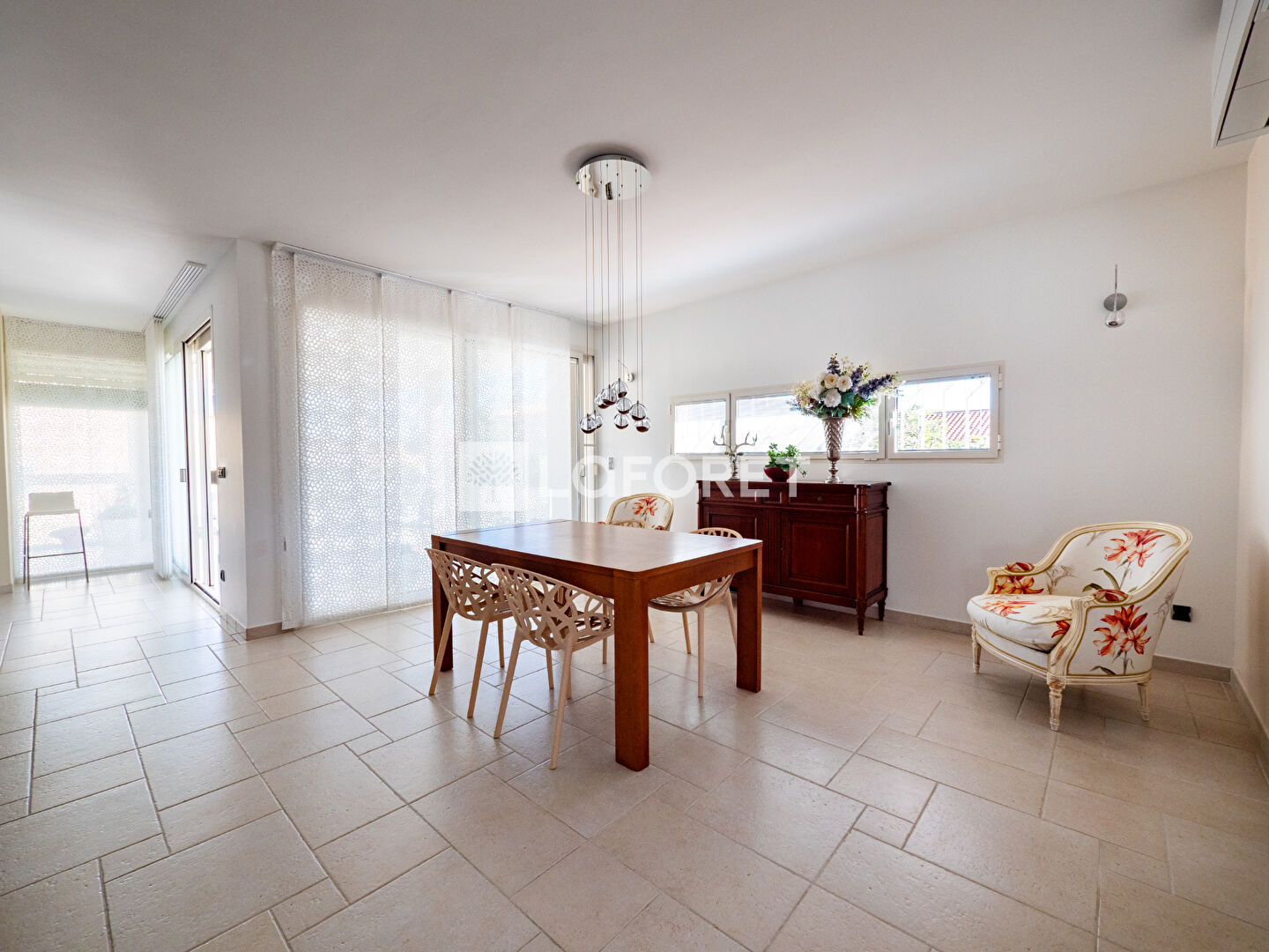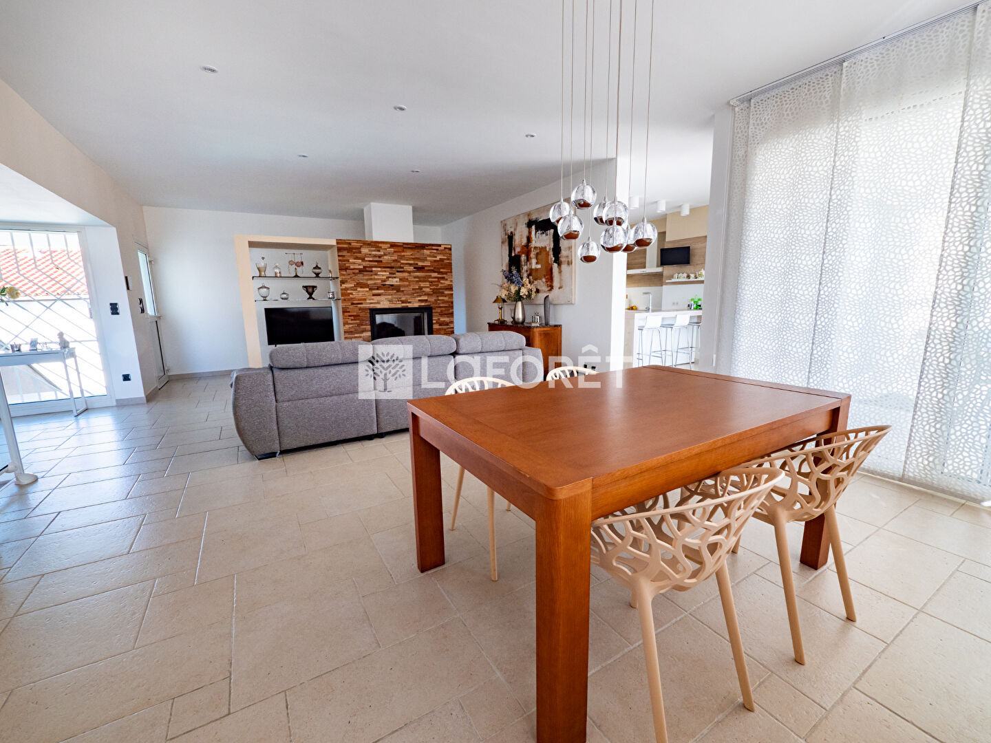 L'espace jour offre un grand salon salle à manger lumineux avec insert et une belle hauteur sous plafond, ainsi qu'une cuisine moderne et fonctionnelle accompagnée de son arrière-cuisine. L'ensemble s'ouvre sur une vaste terrasse avec une superbe vue dégagée sur les Albères, idéale pour profiter de chaque saison.