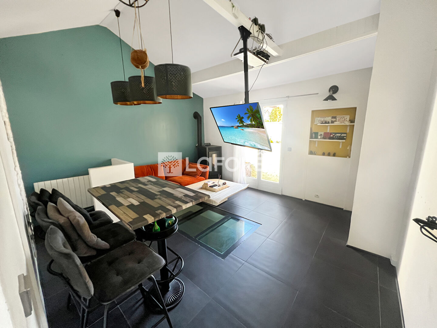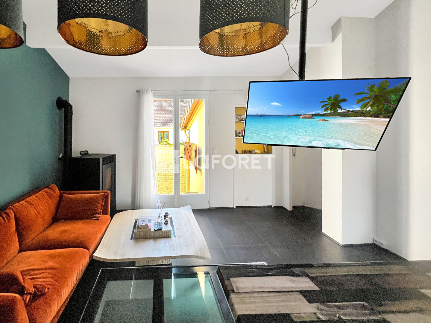 Séjour lumineux avec poêle à granulés et accès à un jardin intime et sans vis-à-vis