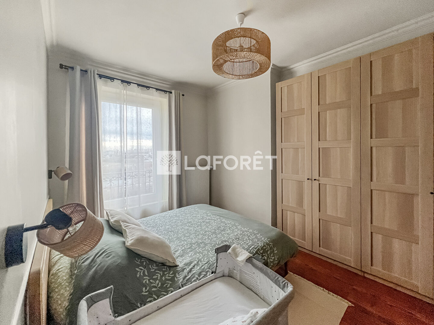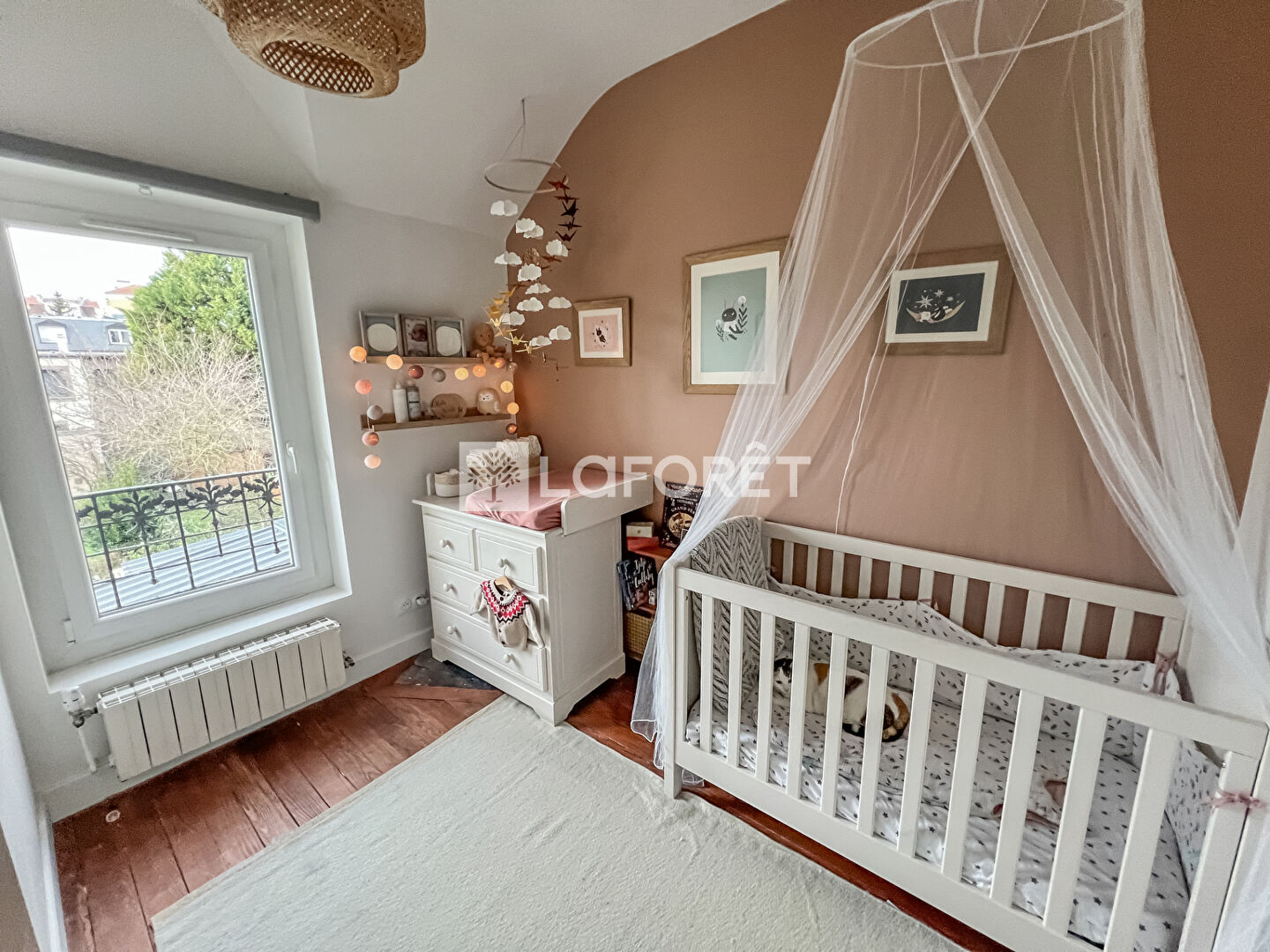 À l'étage, l'espace nuit se compose de trois chambres (dont une chambre de bébé, pouvant faire office de bureau ou de dressing), idéales pour une famille.