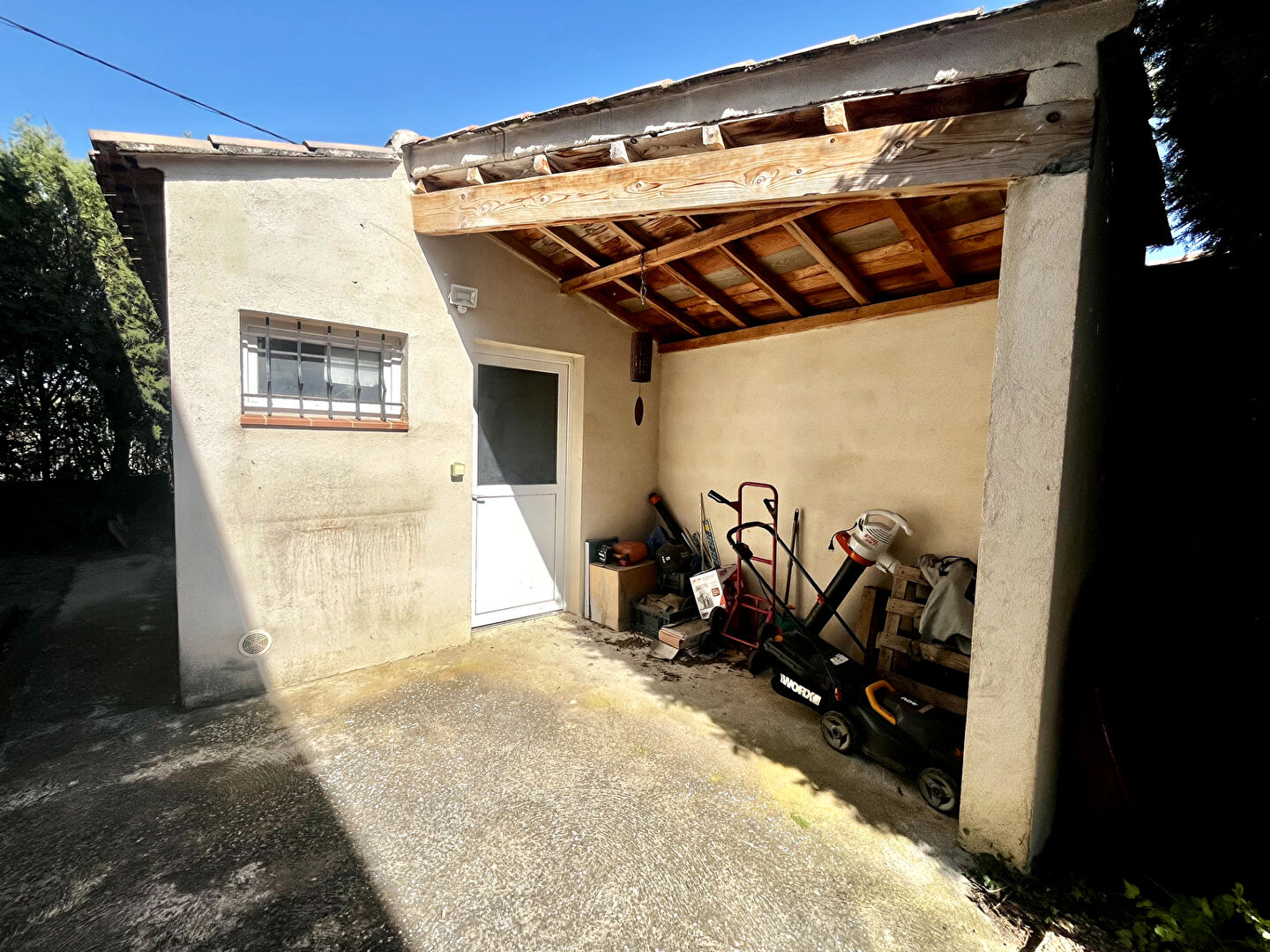 Une place de parking devant la maison vient parfaire l'ensemble, offrant un stationnement facile et pratique au quotidien. Un abri de jardin permet également de stocker vélos et équipements en toute simplicité.