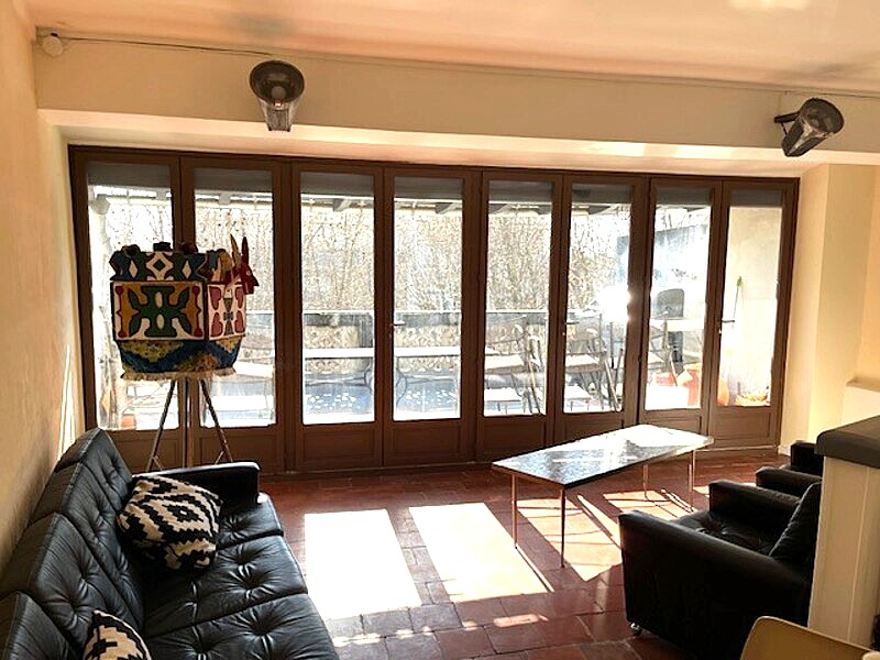 Au dernier niveau, un pièce lumineuse (salon ou chambre supplémentaire) s'ouvre sur une terrasse intimiste dominant les toits du quartier.