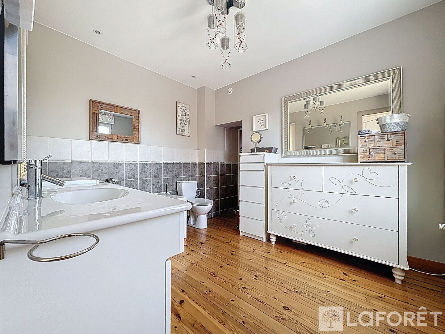 Au premier étage : Un premier pallier desservant d'un côté une grande salle de bains (Douche, Baignoire, Vasque et WC) et de l'autre côté un grand pallier desservant deux chambres avec placards et un espace dressing pouvant servir de petite chambre.