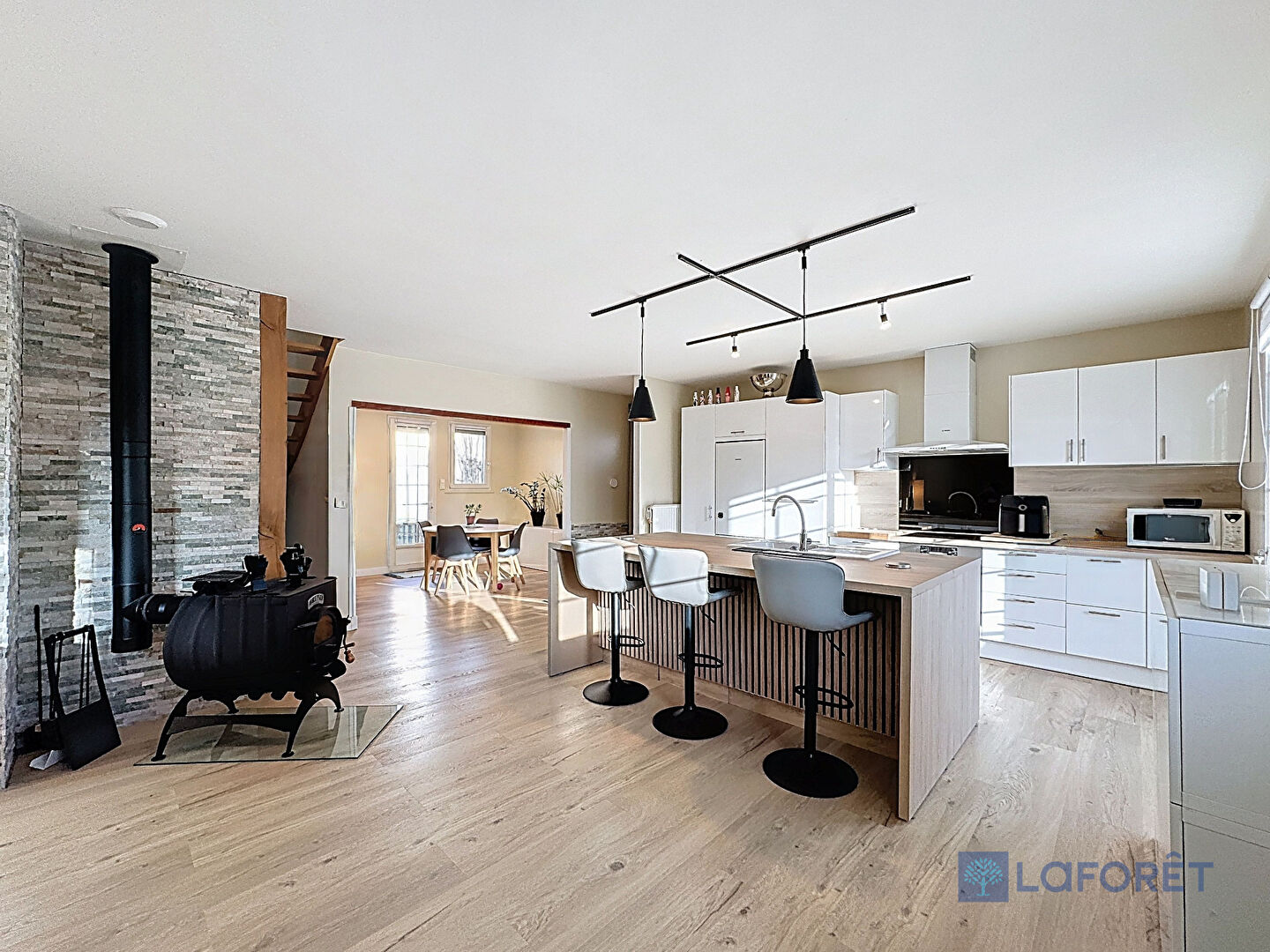 Dès l'entrée, vous serez séduit par un magnifique espace de vie de près de 58 m², baigné de lumière, comprenant un séjour chaleureux, une salle à manger ouverte et une cuisine us moderne, le tout pensé pour un mode de vie de plain-pied des plus confortables.