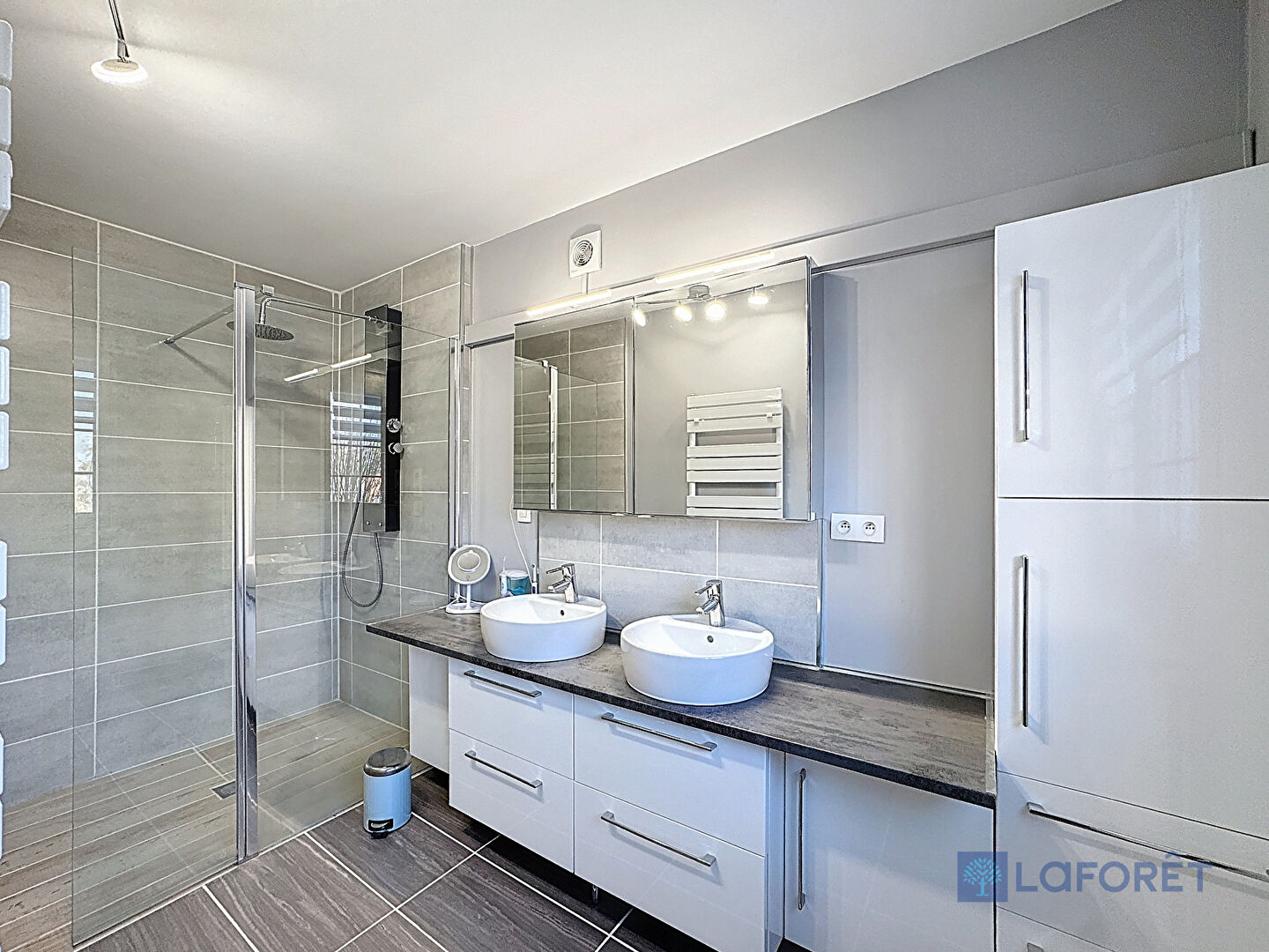 Le rez-de-chaussée propose également un dégagement menant à une superbe suite parentale d'environ 23m², avec salle d'eau privative, douche à l'italienne, rangements intégrés, ainsi qu'une salle de bains indépendante et des WC séparés.