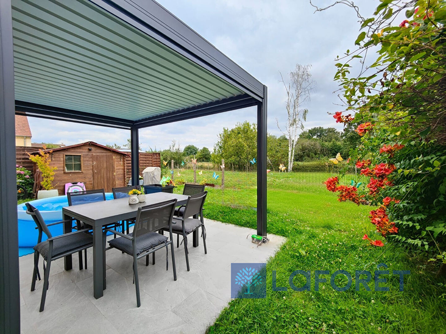 À l'extérieur, profitez d'une terrasse avec pergola (2022), d'un terrain sans vis-à-vis, ainsi que d'un stationnement pour deux véhicules à l'avant de la maison.