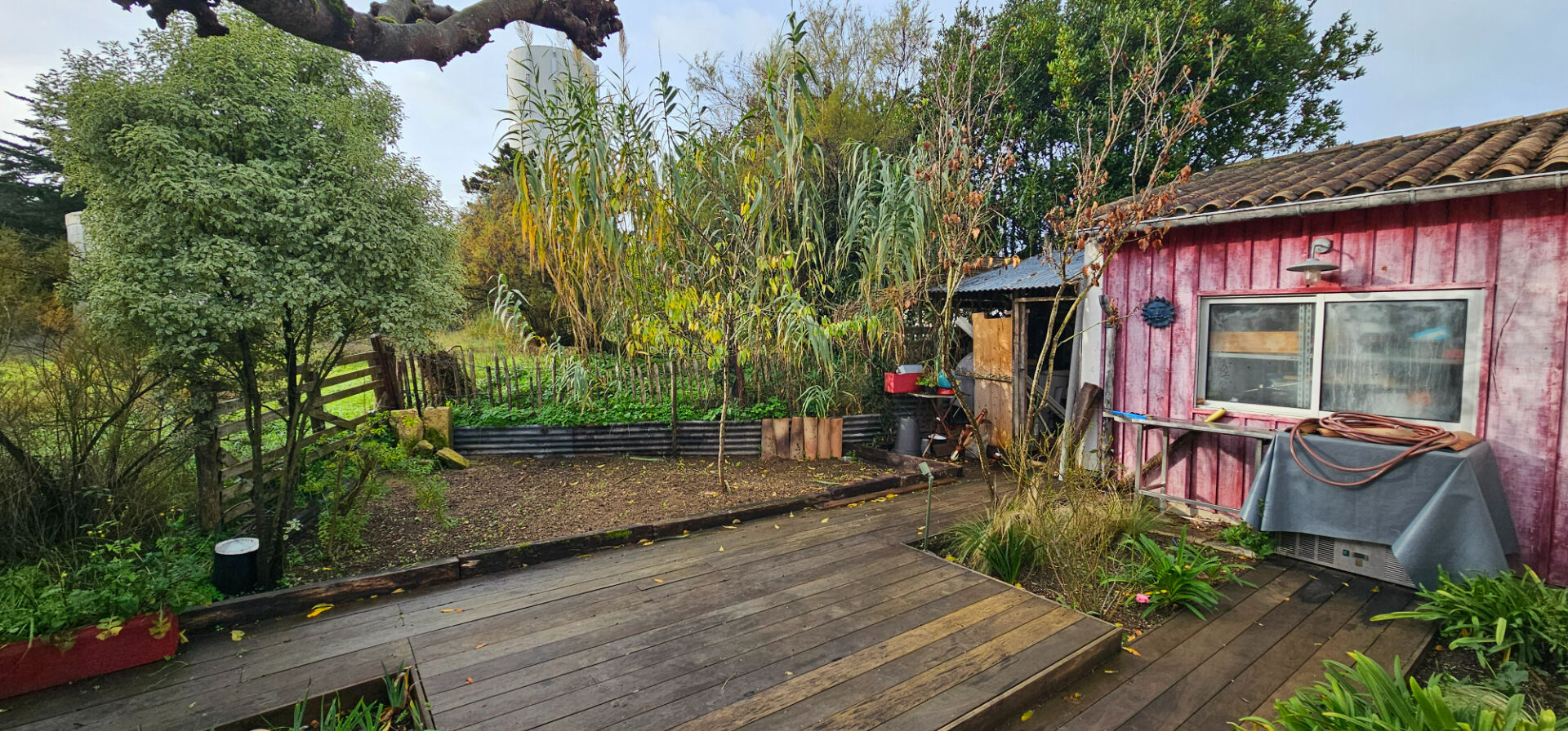 un garage, un forage et une belle vue sur la forêt.