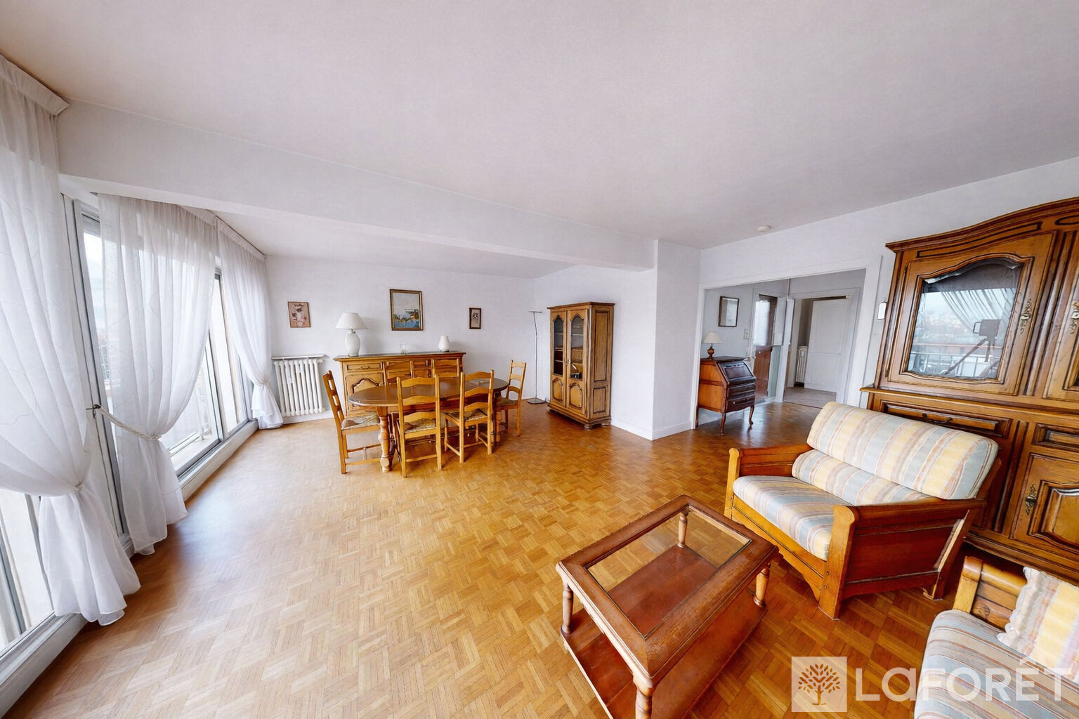 Il se compose d'une entrée avec placard, d'un double séjour baigné de lumière grâce à deux grandes baies vitrées, d'un dégagement avec rangements, d'une cuisine séparée, de deux chambres, d'une salle de bains et de WC séparés. L'ensemble nécessite un rafraîchissement, offrant un beau potentiel de personnalisation.
