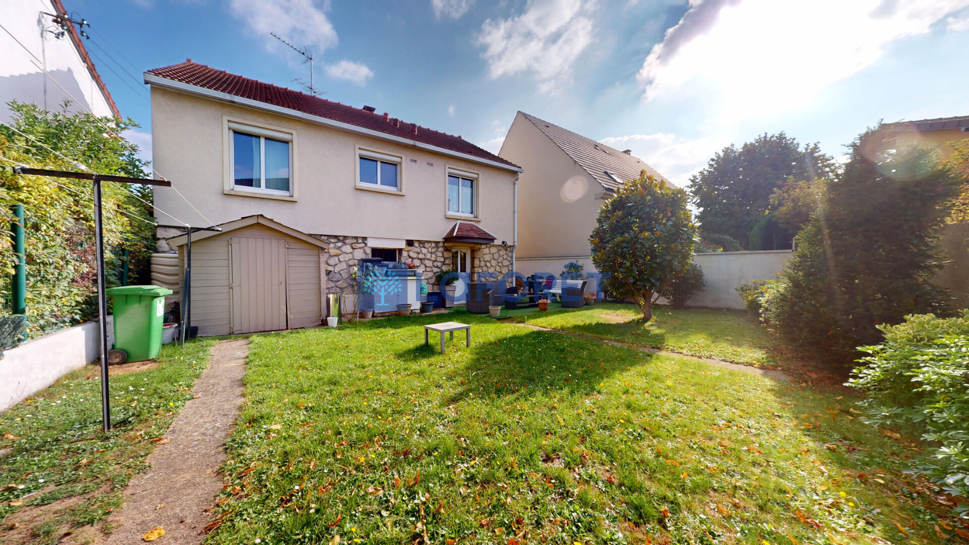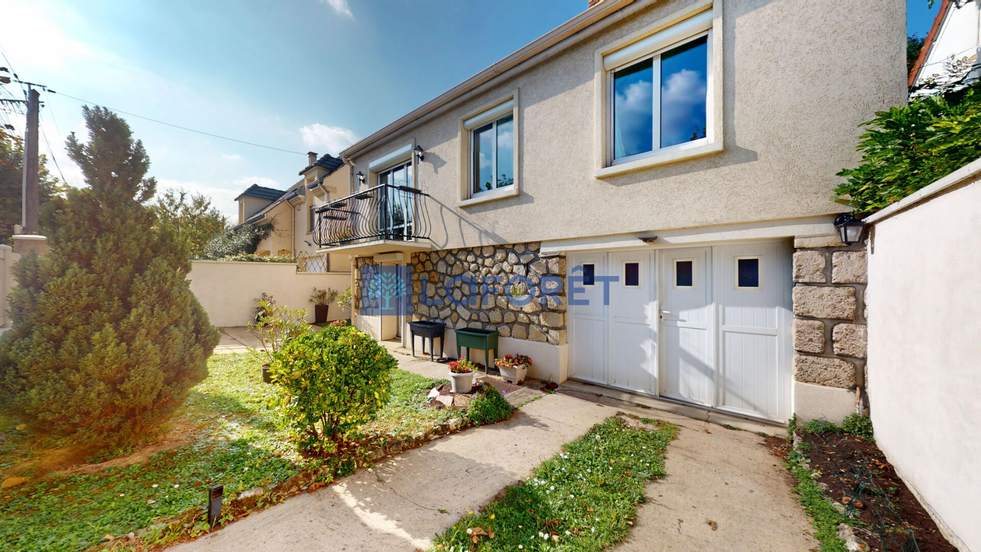 Un grand jardin arboré et une allée pouvant accueillir 2 véhicules en plus du garage.
