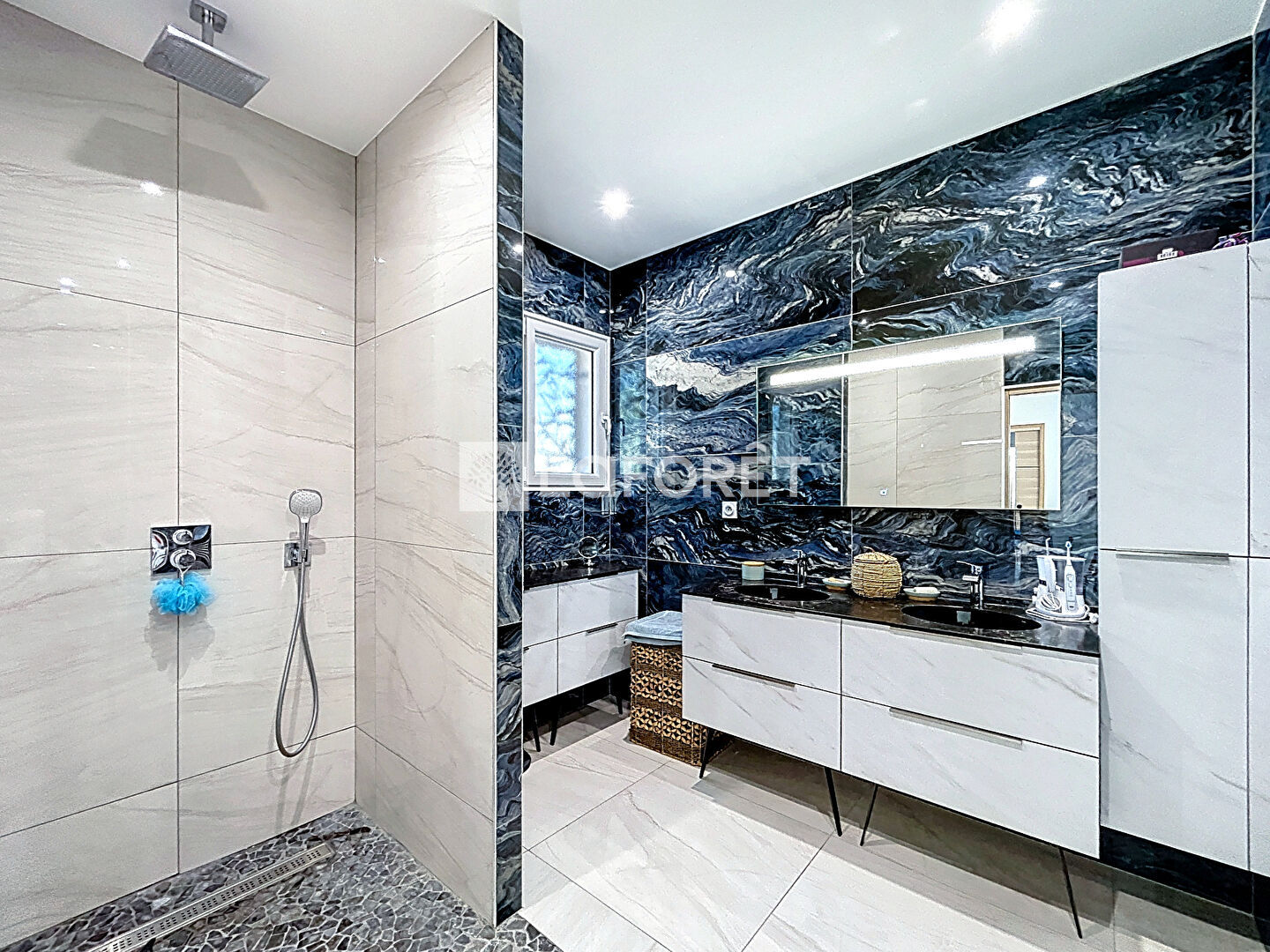 La salle de bain présente des meubles de qualité ainsi qu'une douche à l'italienne.