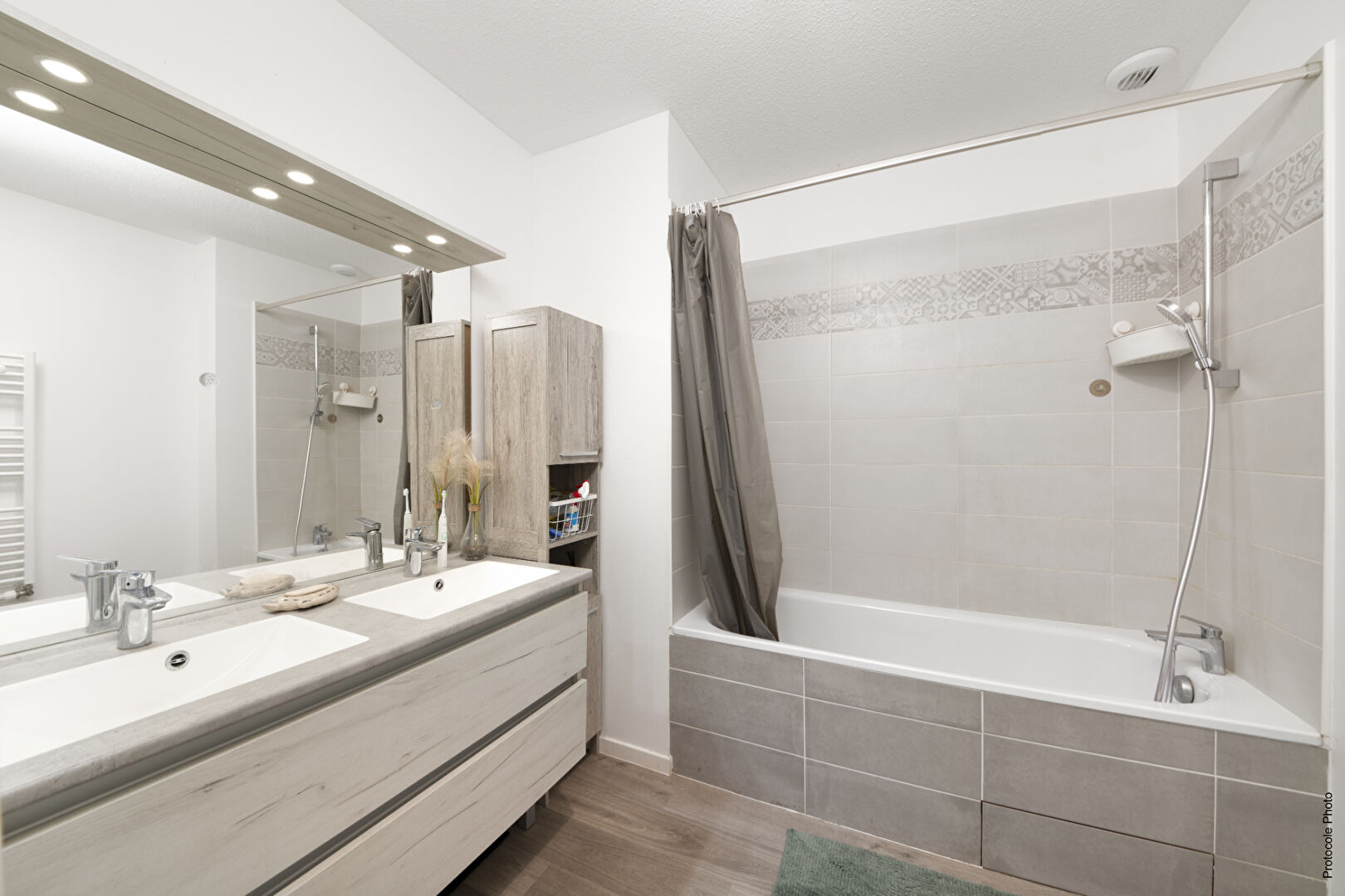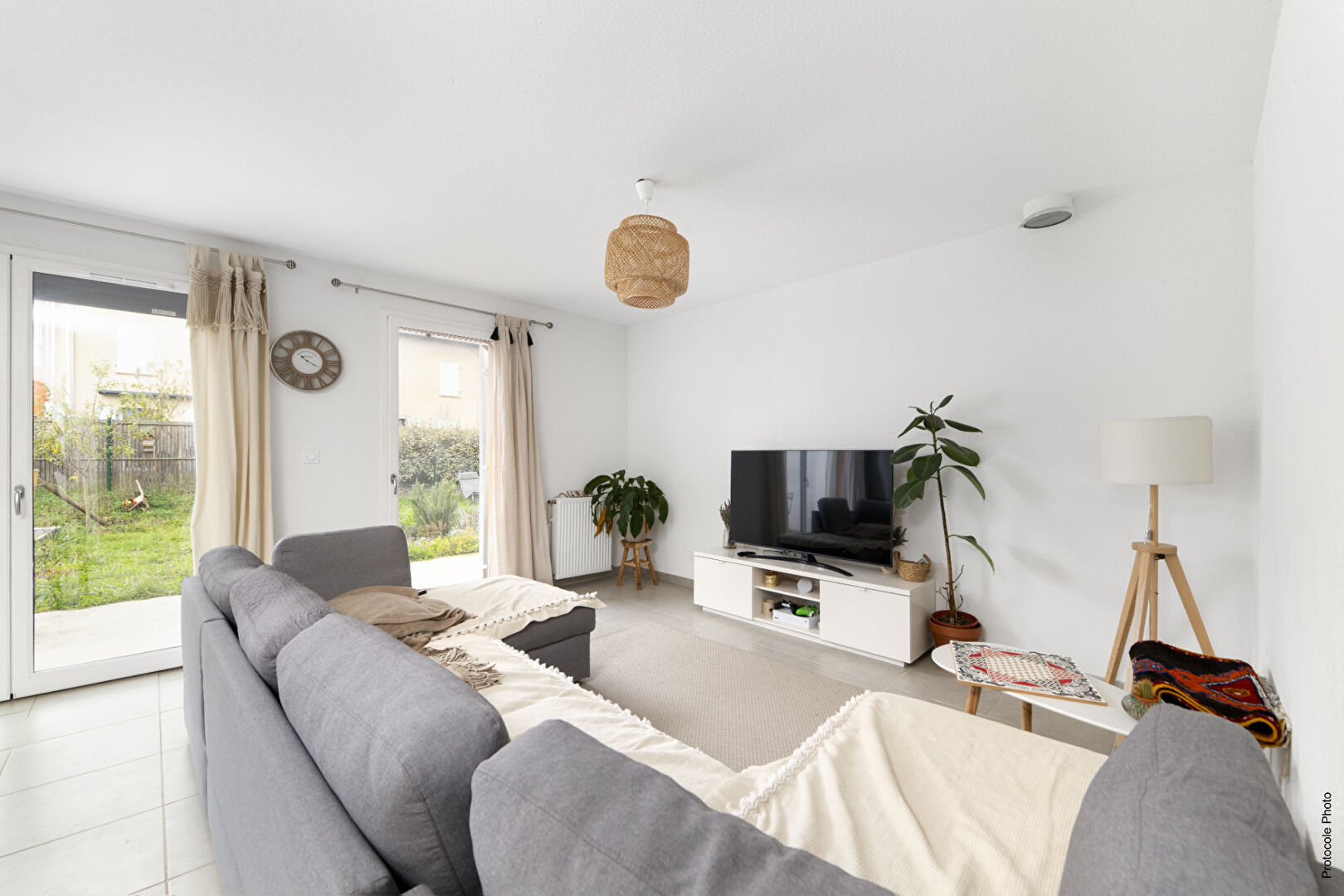 Elle se compose en rez-de-chaussée d'une entrée avec placard et toilettes séparé, d'une pièce de vie lumineuse avec une grande baie vitrée donnant sur le jardin, une cuisine ouverte entièrement aménagée et équipée.
