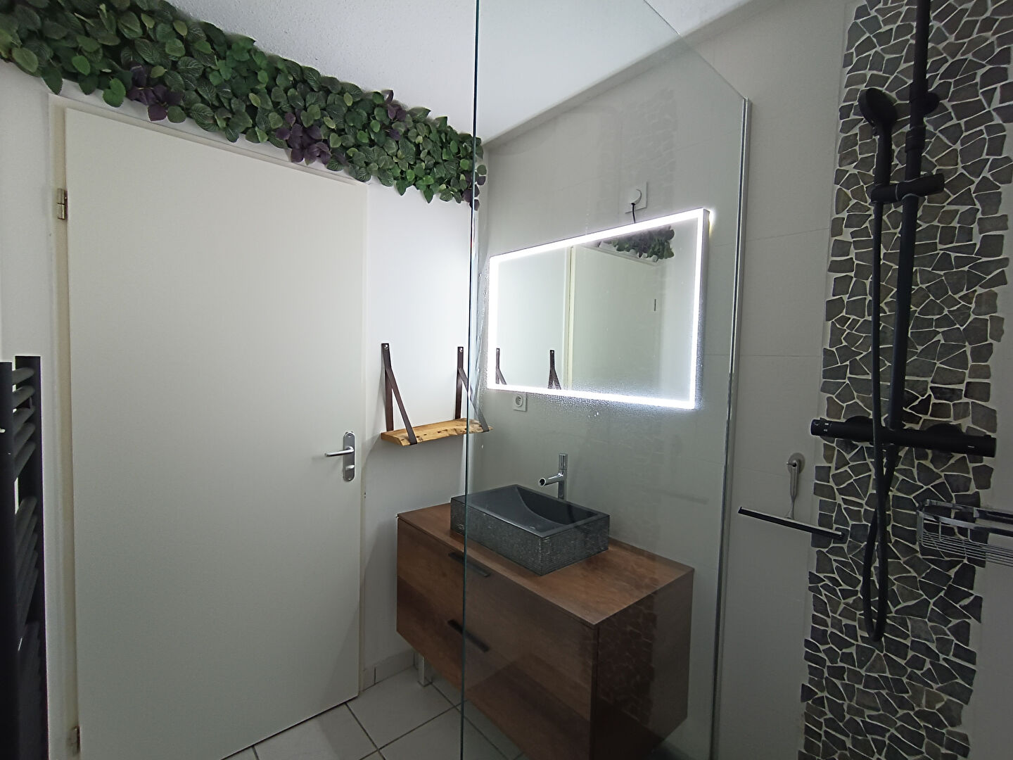 Il se compose d'une entrée avec placard de rangement, d'un séjour lumineux ouvrant sur l'extérieur, d'une cuisine récente avec du mobilier et de l'électroménager de qualité. Deux chambres confortables avec placard, une salle de bains moderne et des toilettes séparés.