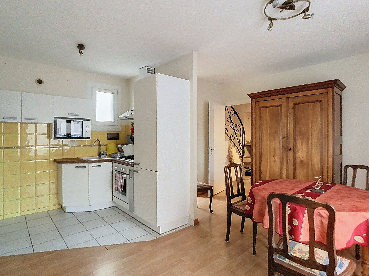 Au rez de chaussée, un salon séjour avec cuisine ouverte aménagée et équipée, salle d'eau, 2 chambres , une courette.