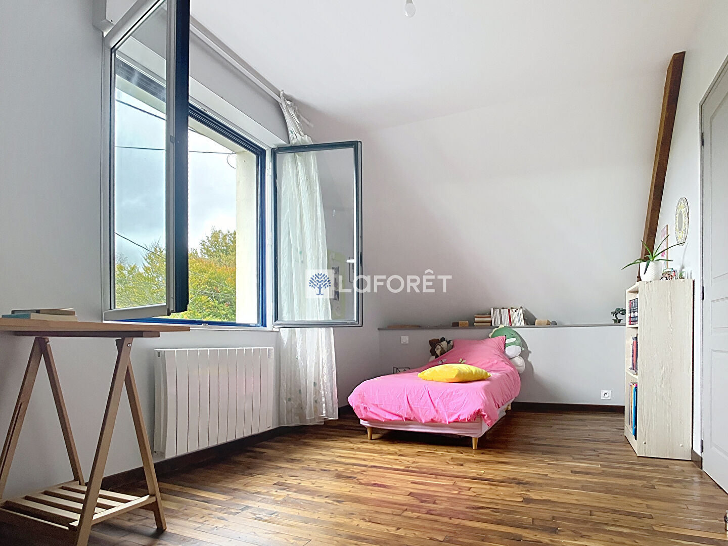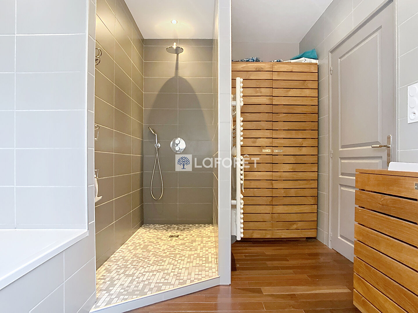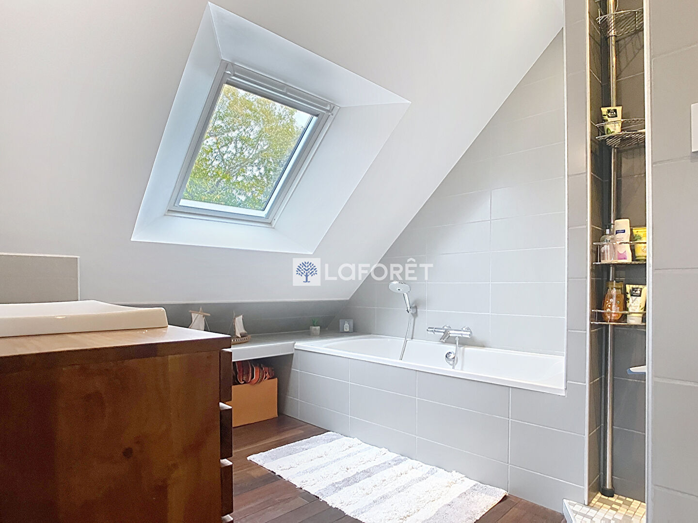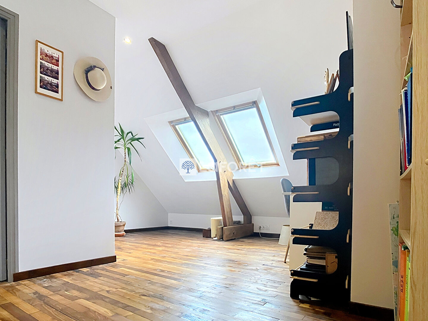 À l'étage, une spacieuse mezzanine baignée de lumière dessert deux grandes chambres avec , une salle de bains avec douche et baignoire, un WC séparé et un dégagement servant de rangements. À l'extérieur, un grand cabanon de jardin vient compléter cet ensemble, offrant un espace supplémentaire de stockage.