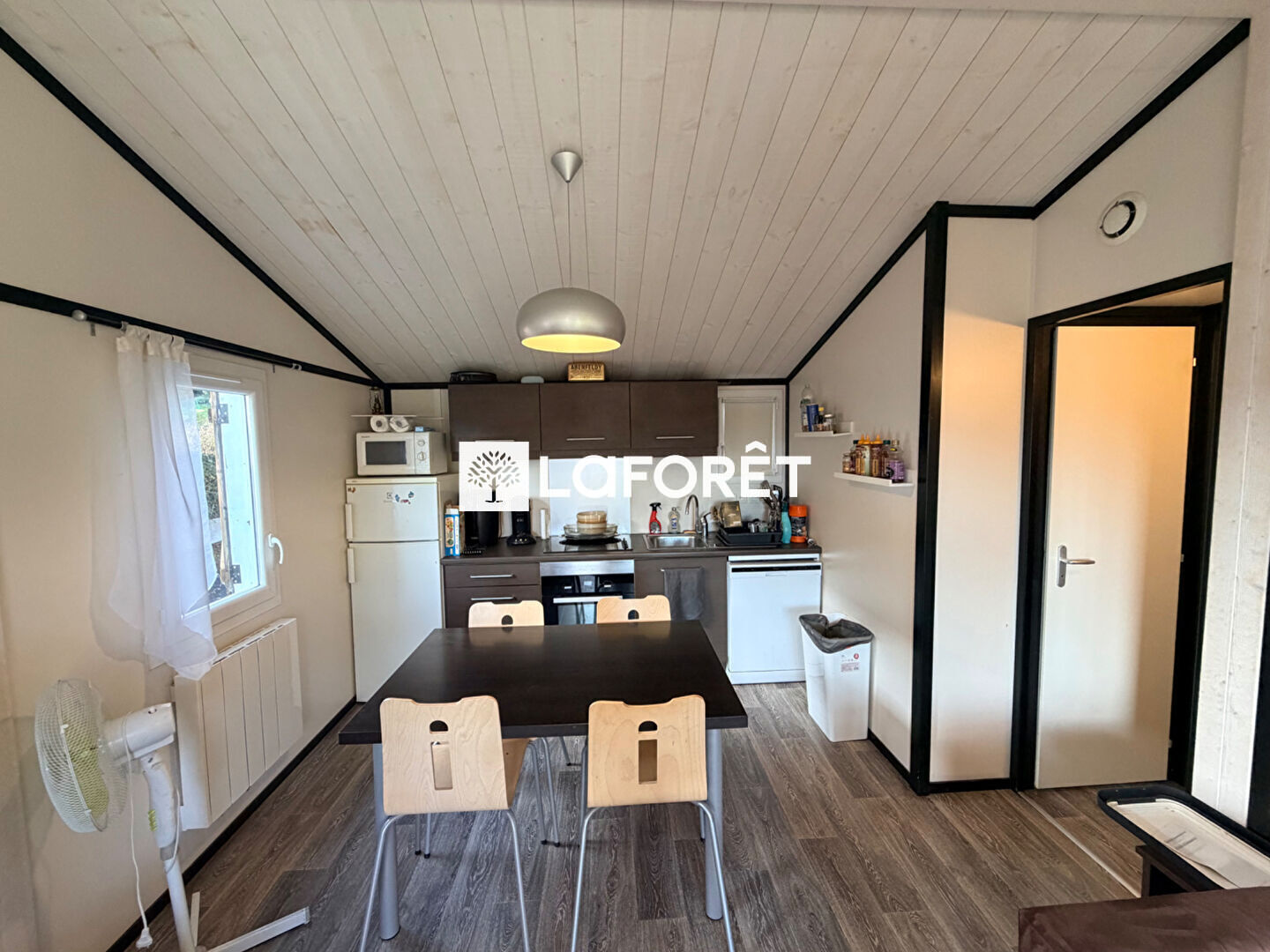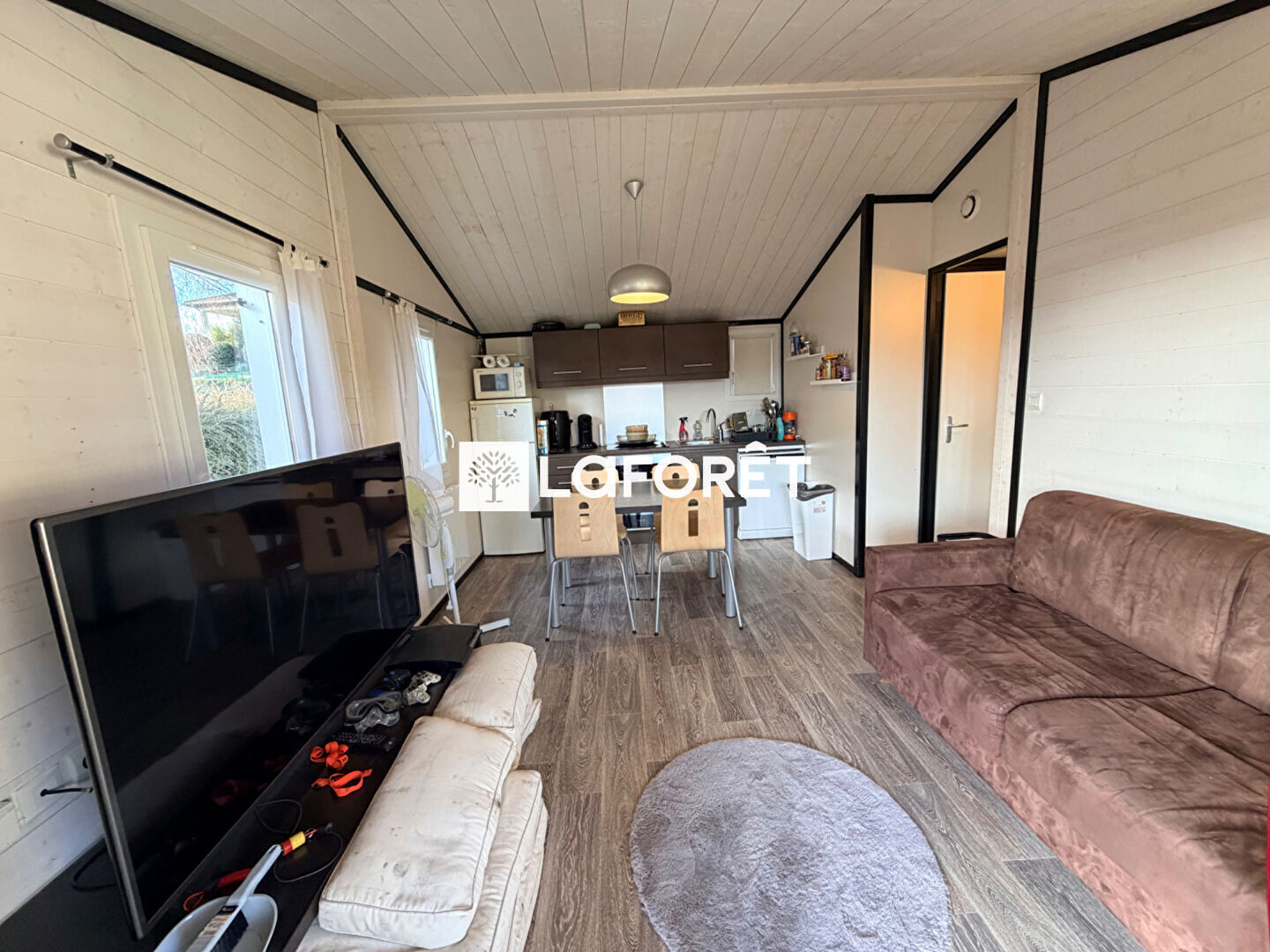 Ce bien comprend une cuisine ouverte sur séjour, deux chambres et une salle de bain.