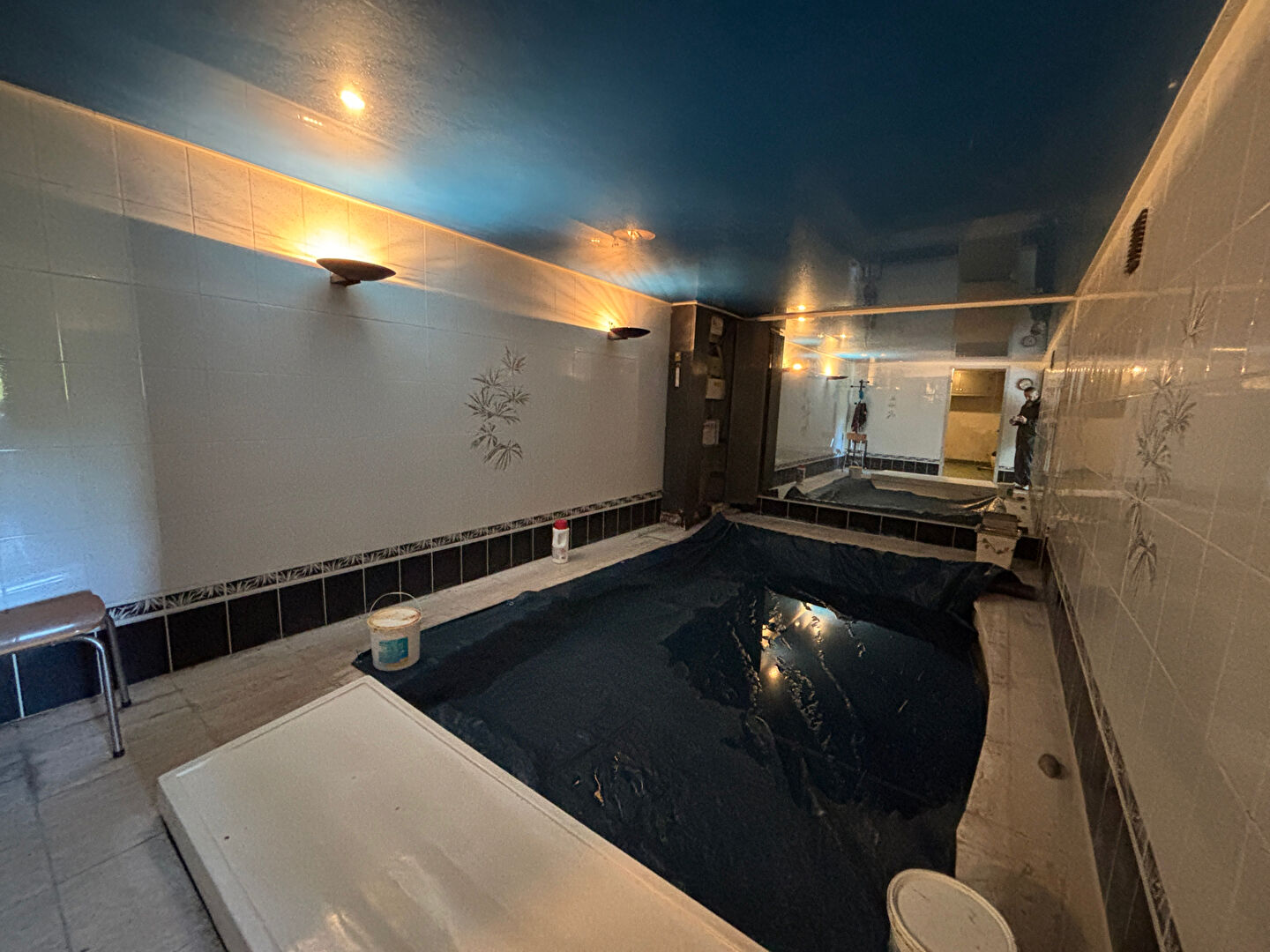 Cette maison familiale est composée en rez de chaussée, d 'une entrée desservant une grande cave, un garage ainsi qu 'une pièce avec une piscine intérieure et sa salle d' eau accolée.