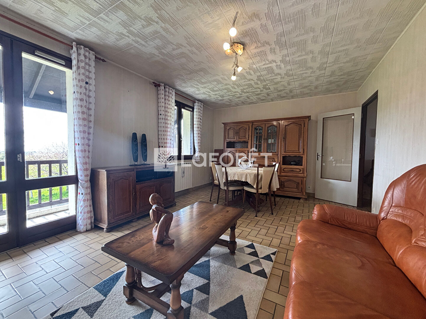 A l'étage, un salon- salle à manger avec balcon, une cuisine ainsi qu' une salle d'eau, un WC et trois chambres.