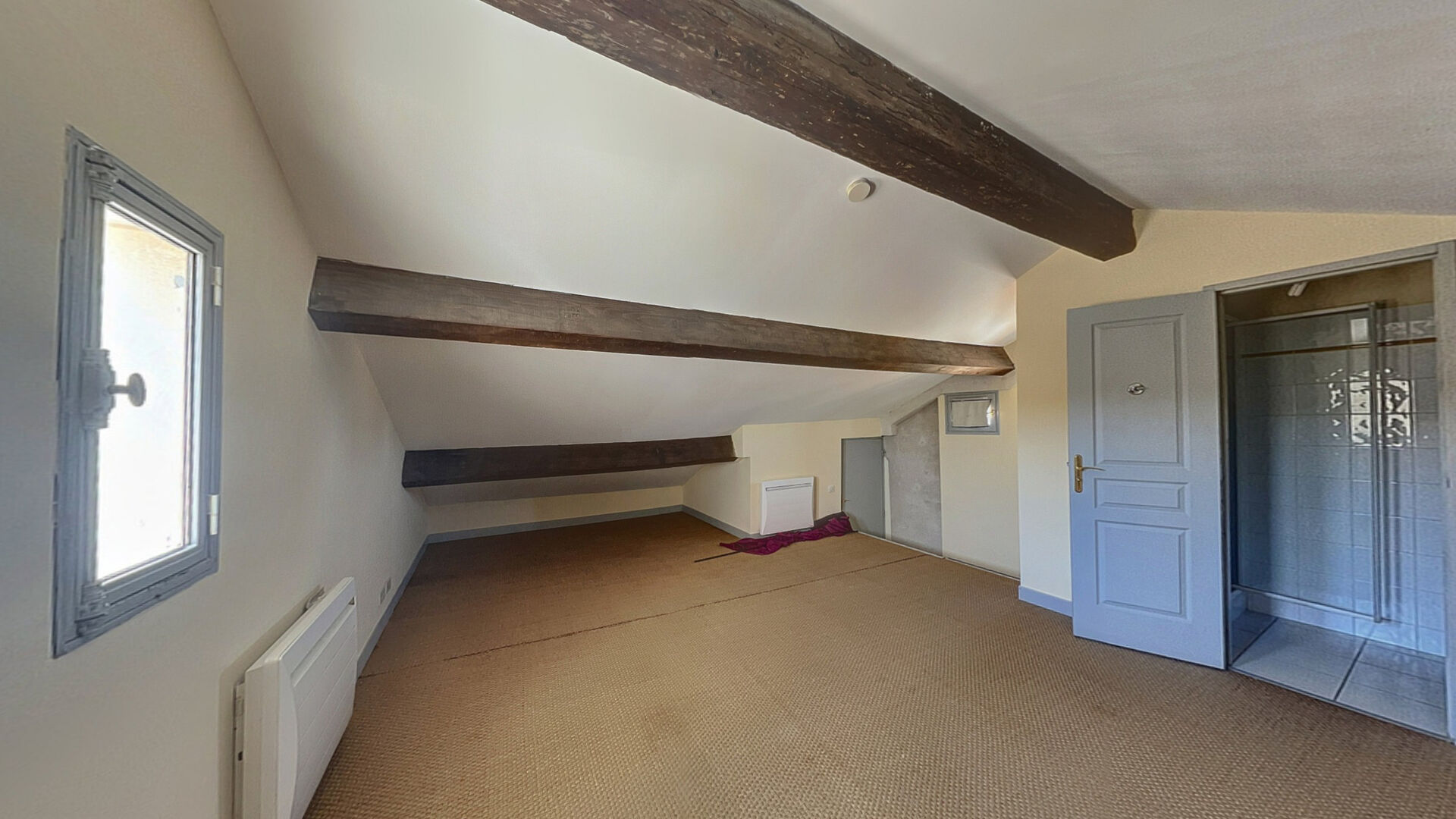 Une seconde entrée donnant directement sur une grande chambre mansardée d'environ 30 m² au sol ( 16,50m2 dans le sens carrez) avec sa propre salle d'eau.