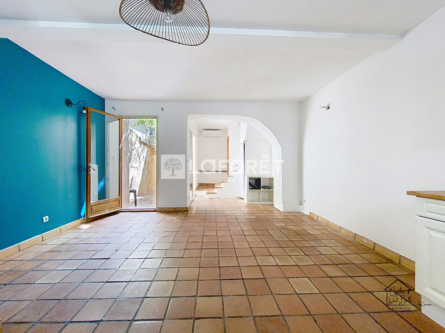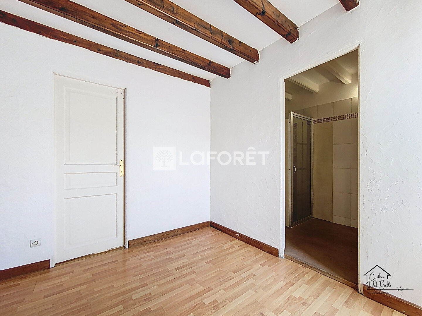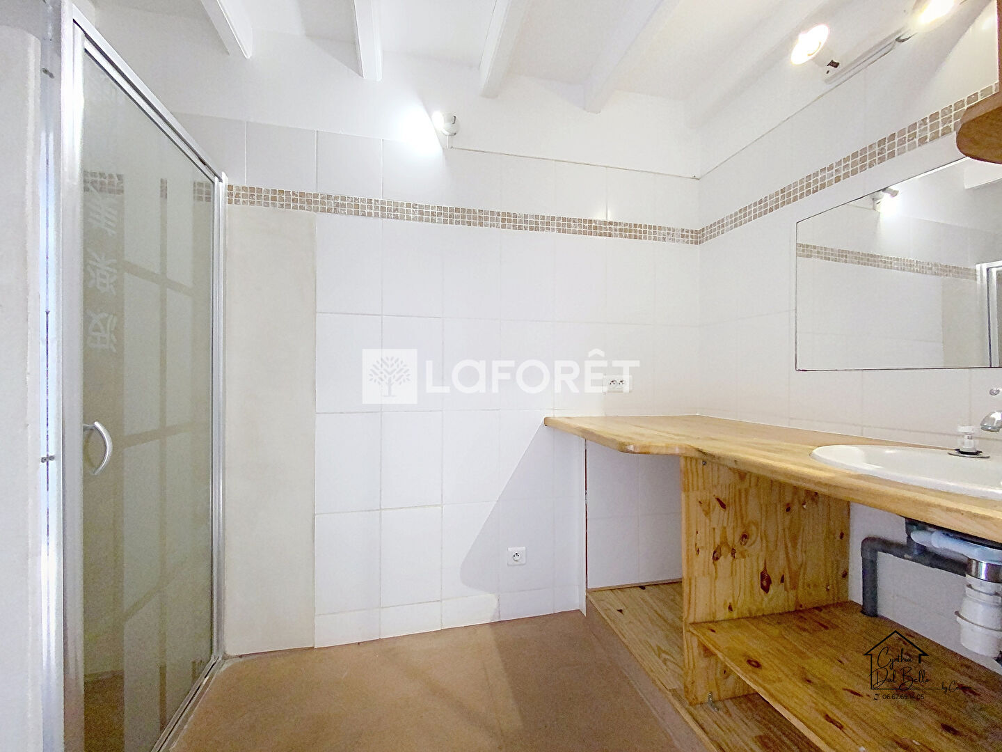 Au premier étage, une pièce de vie donne accès à une terrasse ensoleillée exposée plein sud, une salle d'eau moderne ainsi qu'une chambre avec placard.