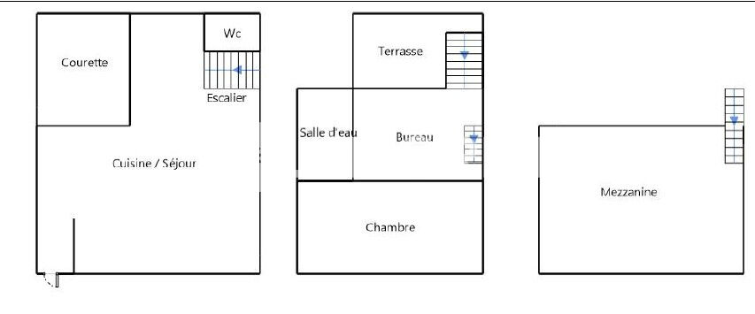 Au rez-de-chaussée, l'entrée s'ouvre sur un séjour donnant sur cuisine américaine fonctionnelle. Une cour privative permet de profiter d'un petit extérieur intime. Un WC indépendant complète ce niveau.