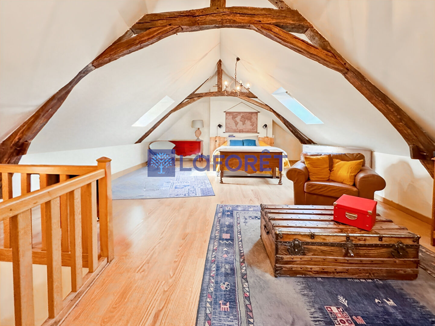 Au second étage, vous découvrirez une vaste chambre mansardée avec poutres apparentes, disposant de son dressing et de sa salle de bains privative.