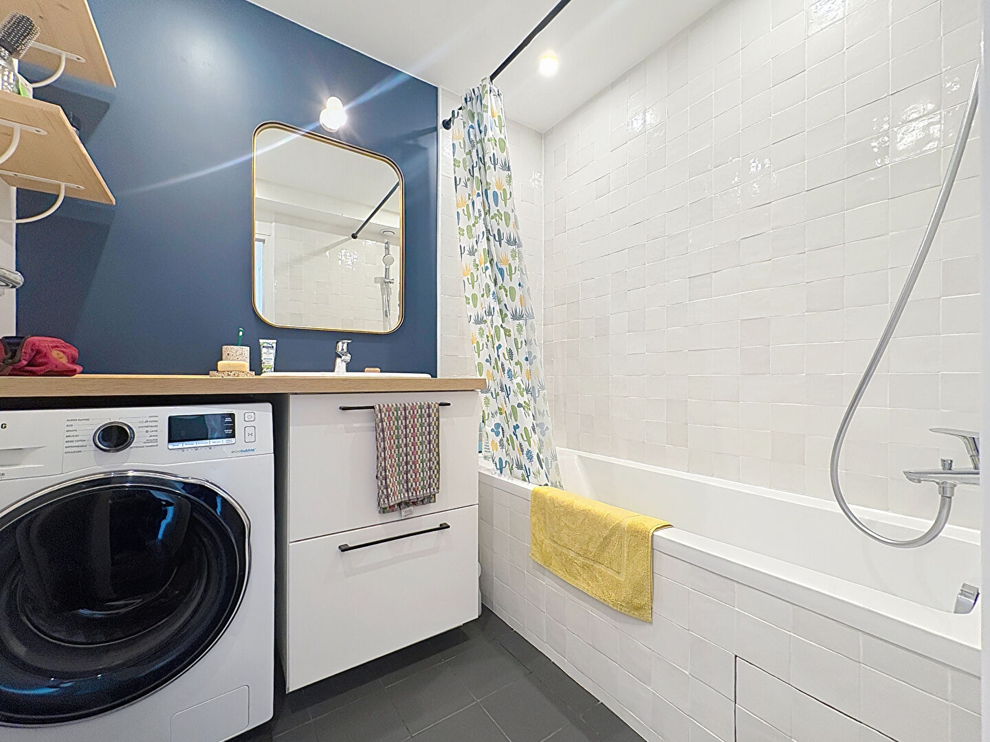 La configuration est idéale : entrée avec rangements, pièce de vie avec cuisine ouverte et toute équipée, WC indépendants, salle-de-bains avec baignoire et vasque, chambre confortable.