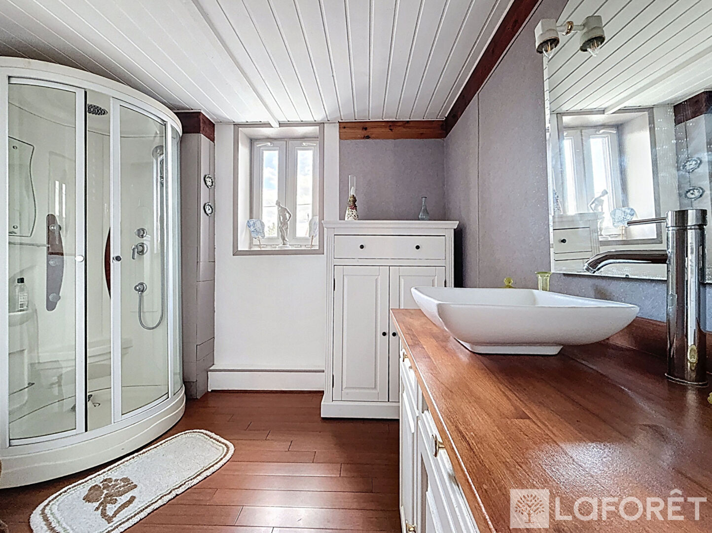 Le rez-de-chaussée se compose d'une vaste pièce de vie ouverte sur une cuisine équipée, dont les différents parquets (teck, bambou et chêne) soulignent l'ambiance chaleureuse de ce bien.