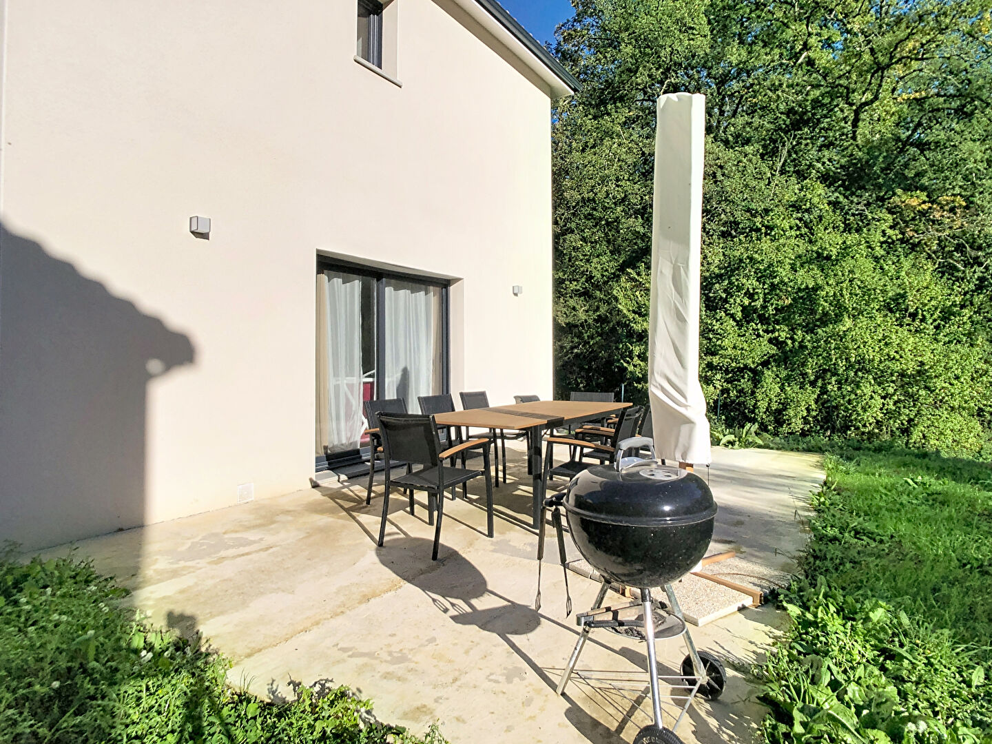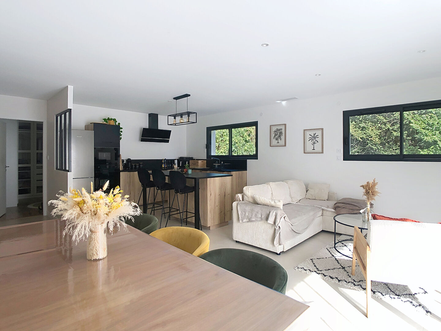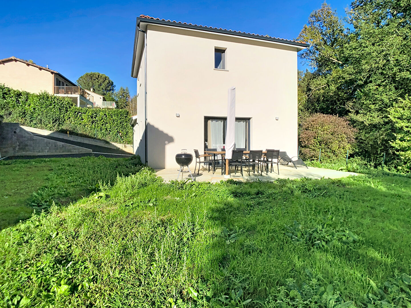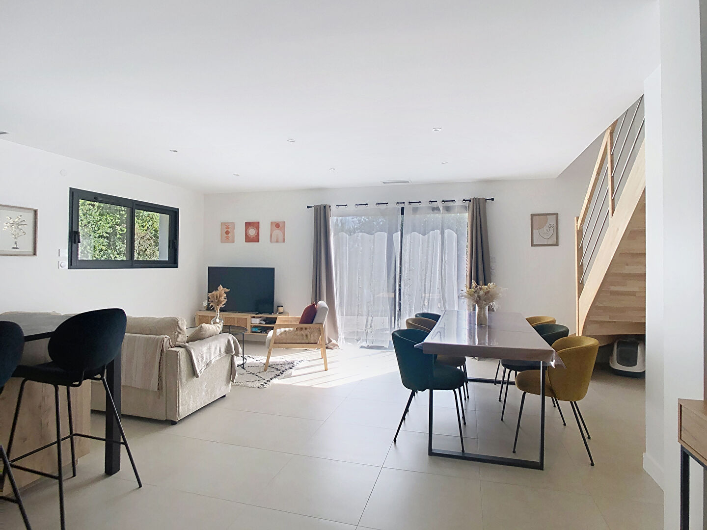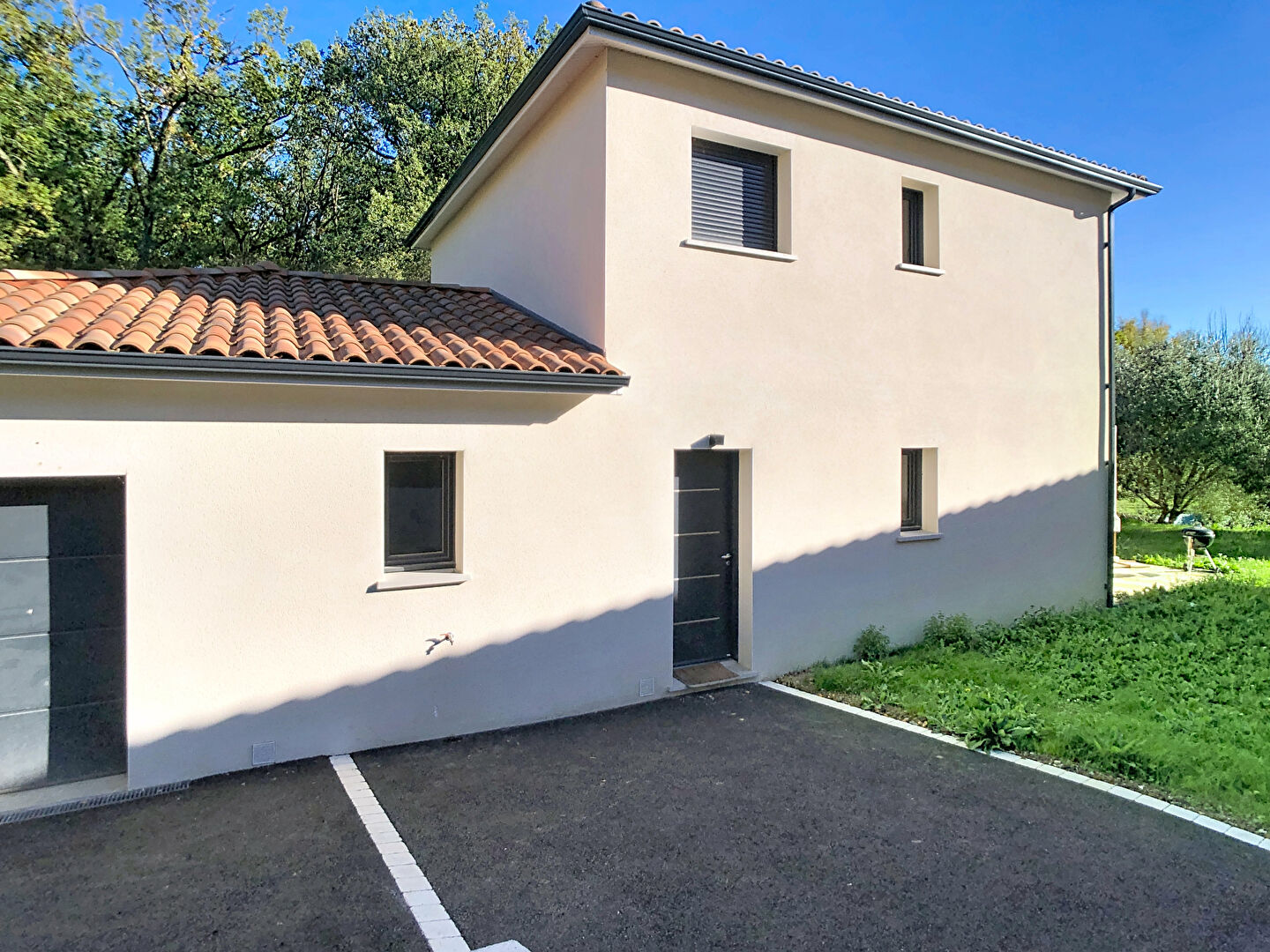 Superbe maison T5 récente de 2023 RT 2012 en excellent état, d'environ 108.37m². Elle se compose au rez de chaussée d'une entrée ave rangements et WC, une lumineuse pièce de vie, une cuisine ouverte, un cellier, une suite parentale avec dressing et salle d'eau. A l'étage, vos trouverez 3 chambres, et une salle de bains avec WC. La maison dispose également d'un garage attenant avec accès par le cellier. Volets roulants électriques, pompe à chaleur gainable. Terrain de 413m² piscinable. REF:4300