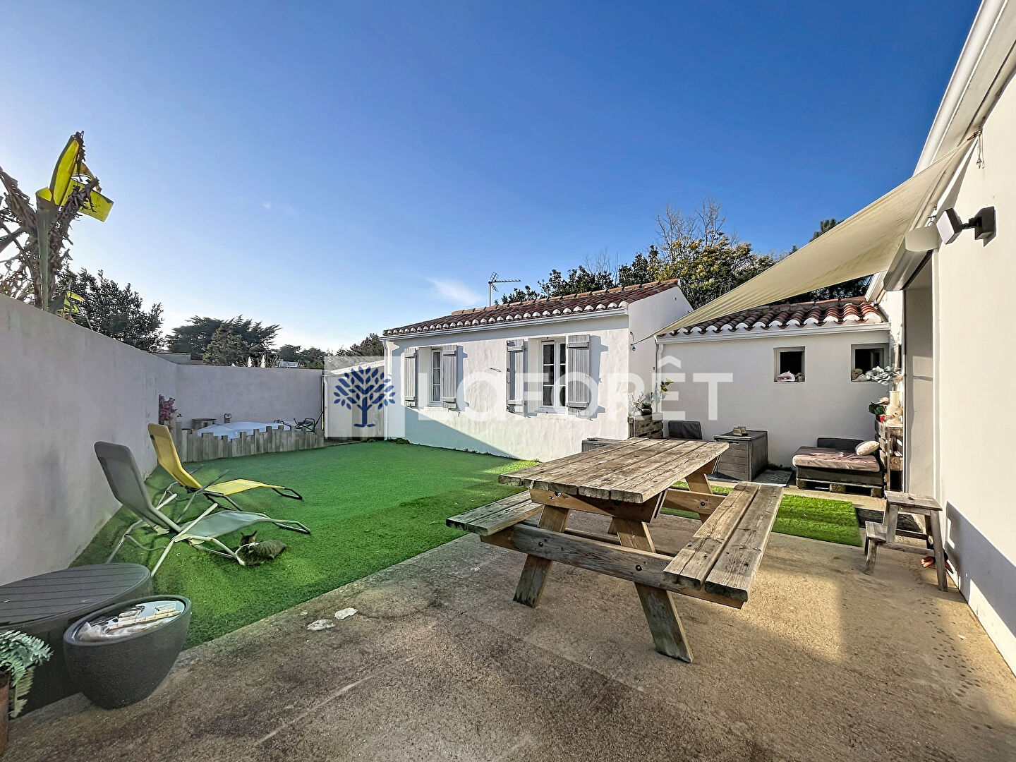 À l'abri des regards, le jardin clos et sa terrasse exposée sud-ouest permet de profiter pleinement des journées ensoleillées et des soirées d'été dans un environnement calme.