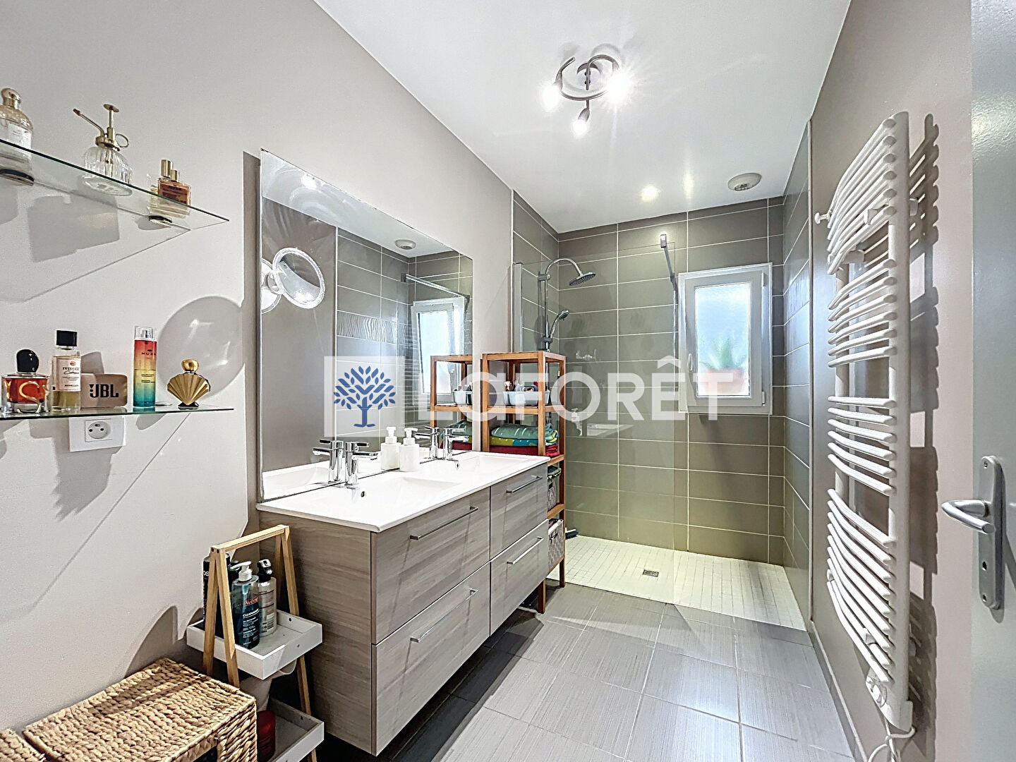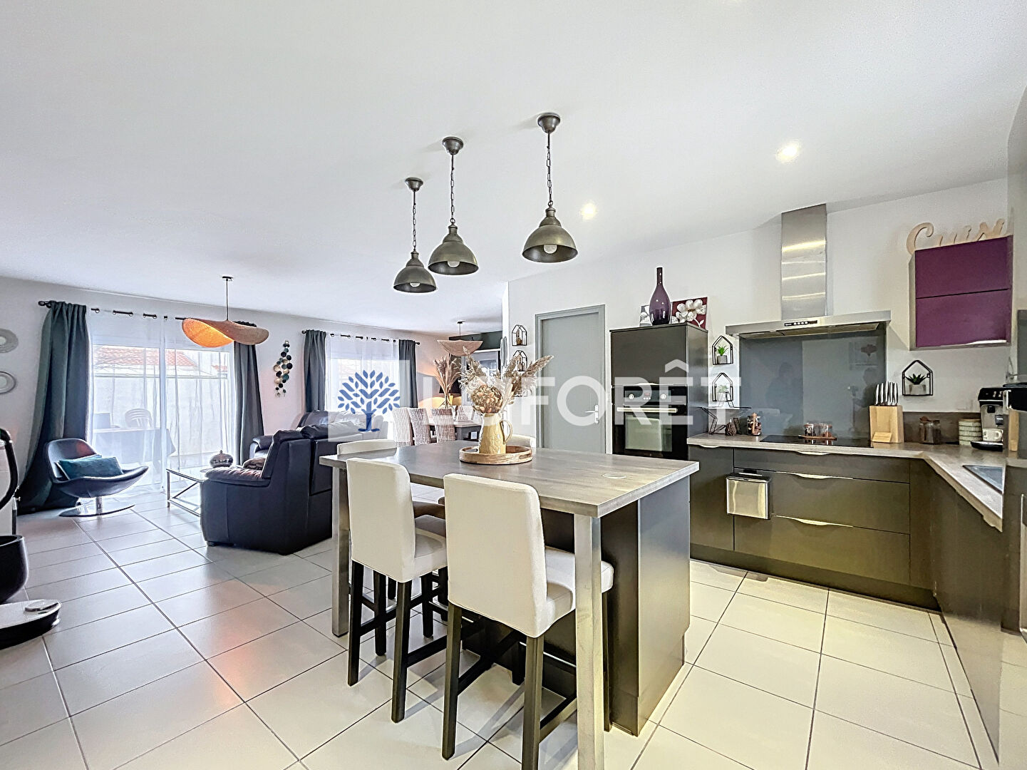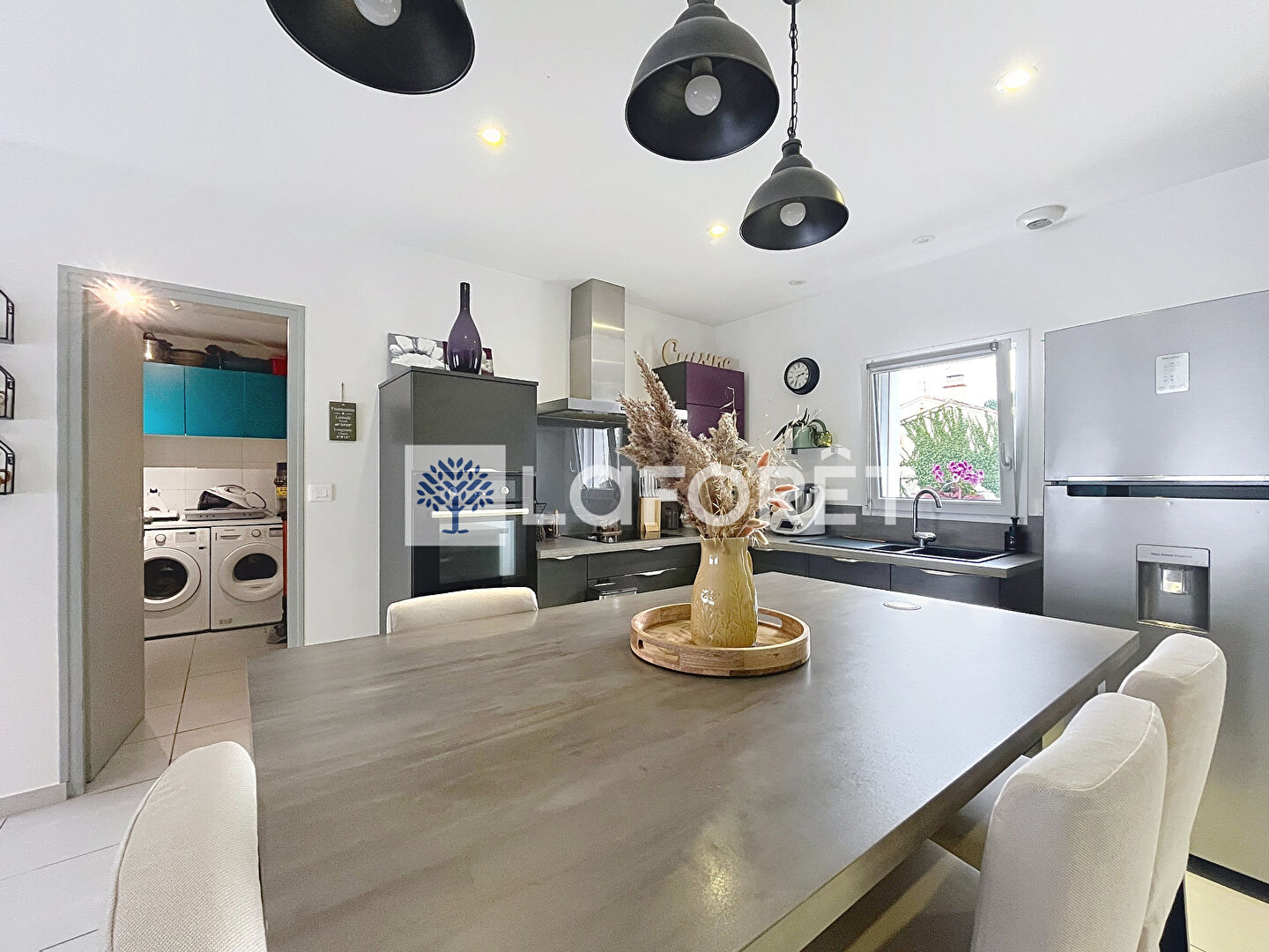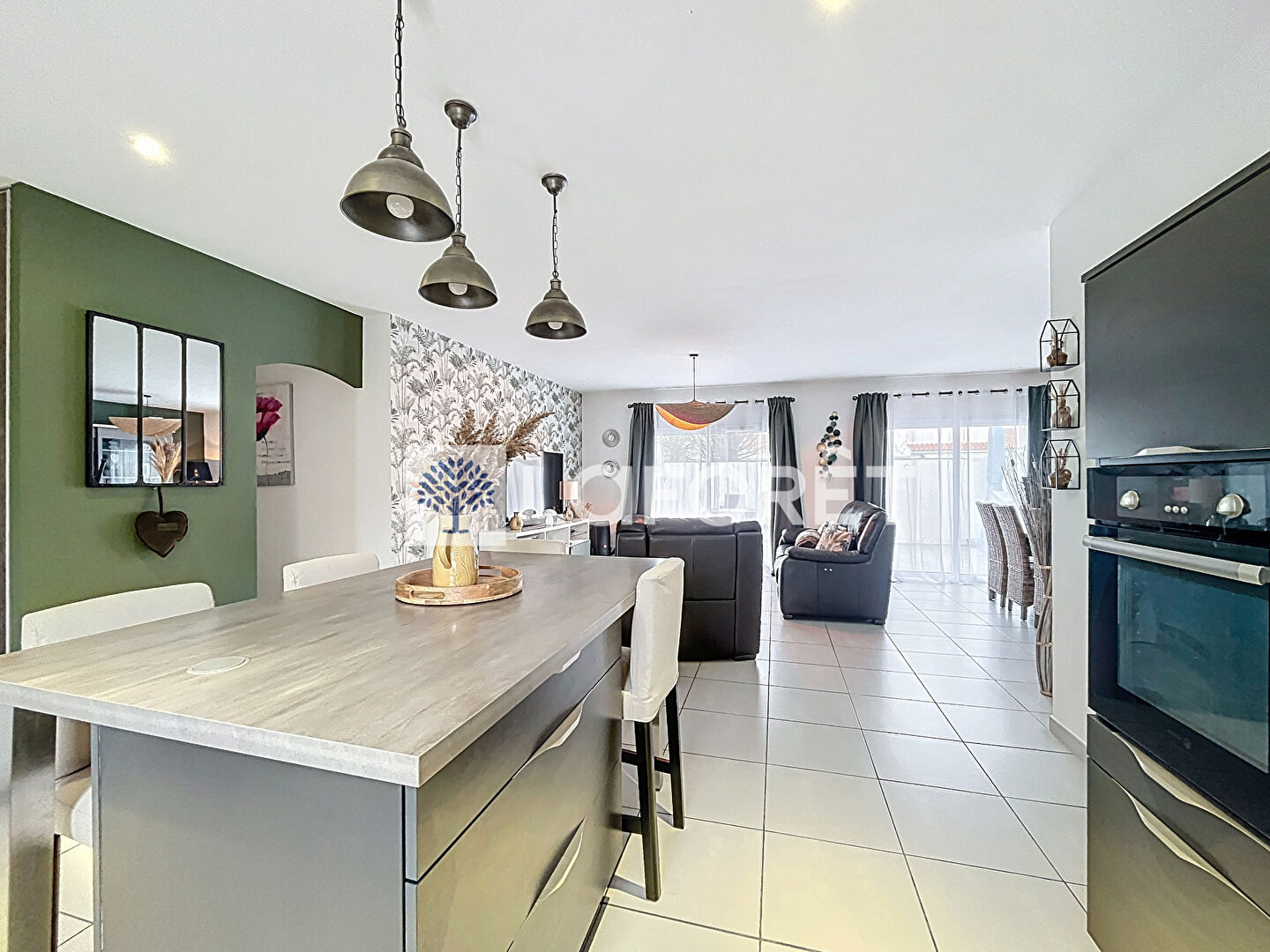 Elle offre un beau salon-séjour exposé ouest d'environ 46 m², avec une cuisine ouverte aménagée et équipée, pensé pour des moments de convivialité. La maison dispose de trois chambres, d'un cellier ainsi que d'un garage de 12m², complété par d'une place de stationnement.
