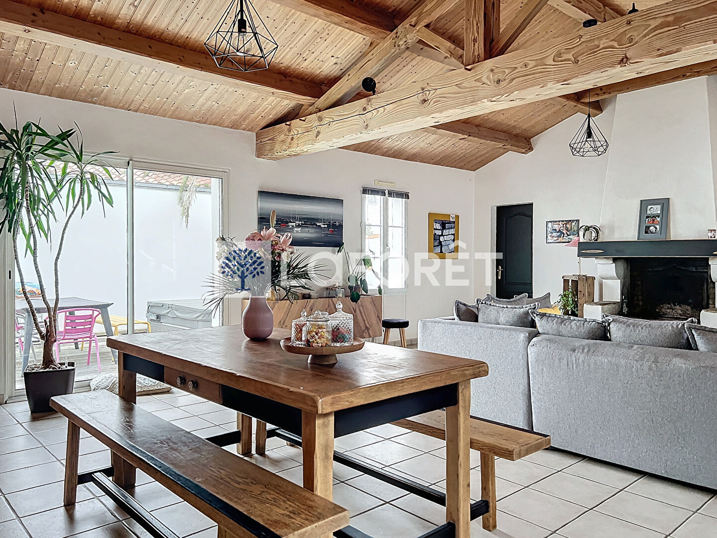 Elle comprend une belle pièce de vie de 50 m² avec cheminée, une cuisine aménagée et équipée, ainsi qu'un cellier .