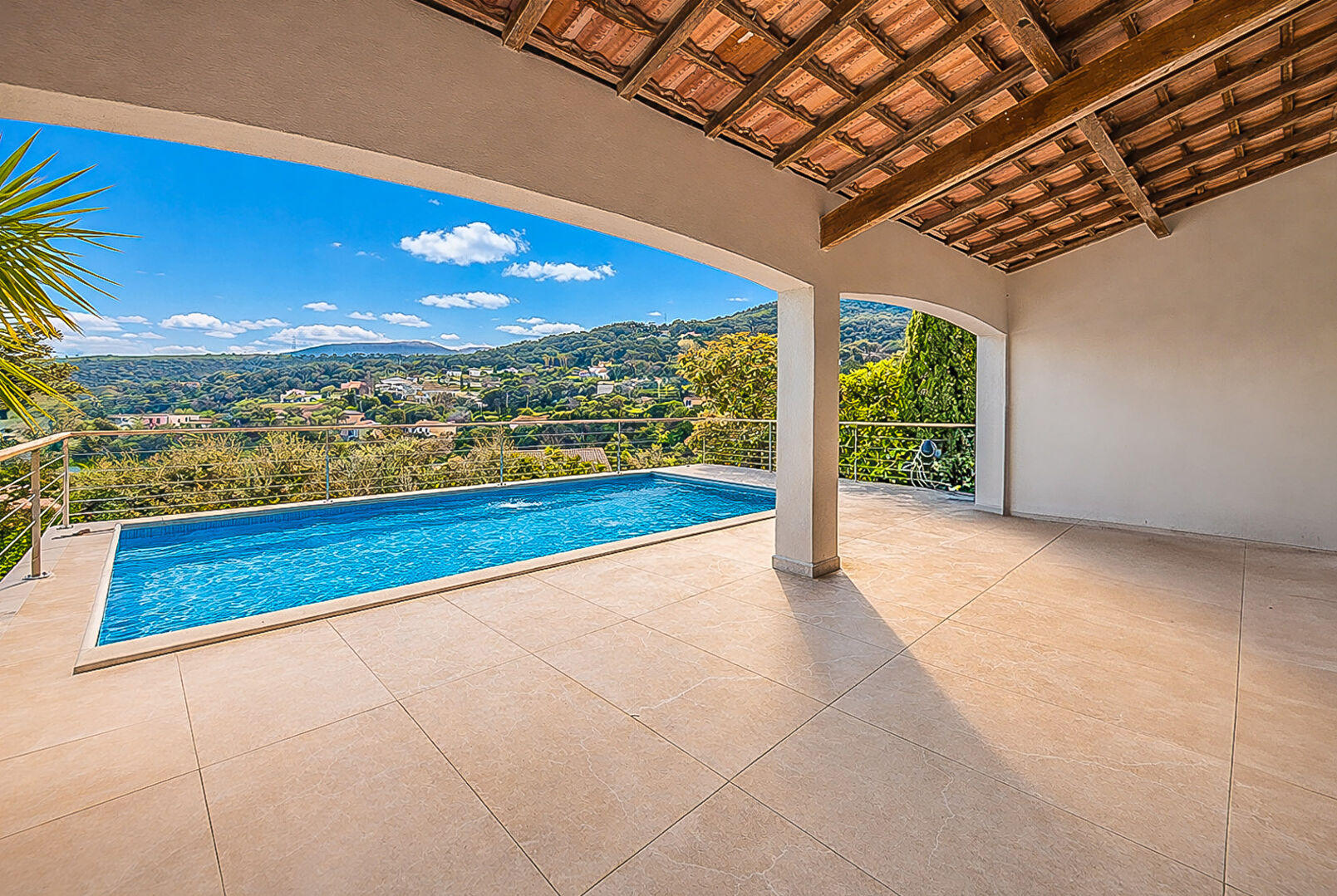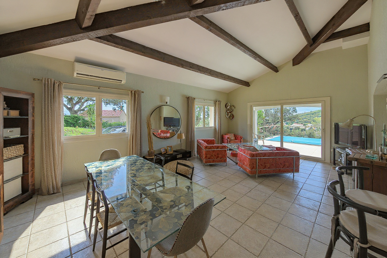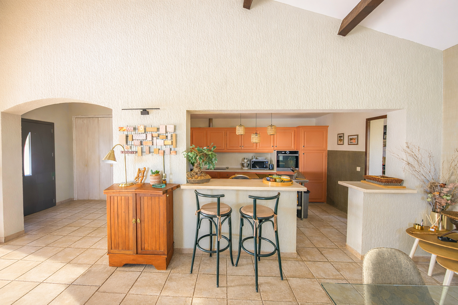 AGENCEMENT : Une entrée desservant un séjour avec un plafond cathédrale offrant luminosité et espace, deux baies vitrées s'ouvrent sur une terrasse ombragée avec piscine.