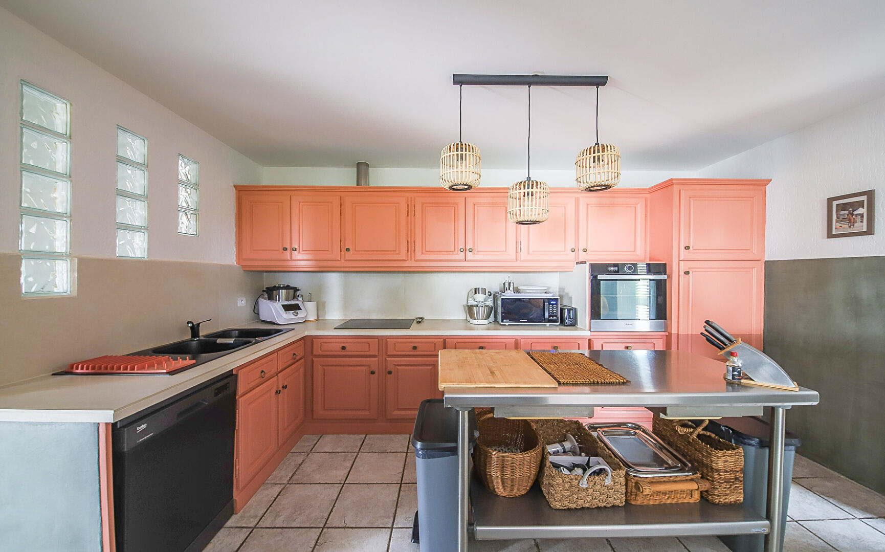 Une cuisine semi-ouverte, aménagée et équipée, prolongée par une buanderie pratique et fonctionnelle permet de bénéficier de nombreux espaces de rangement.