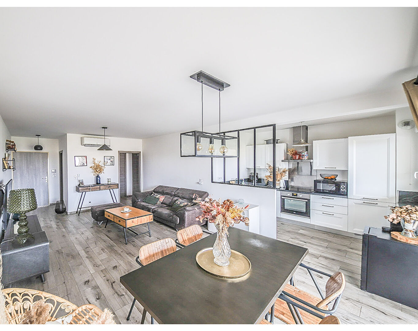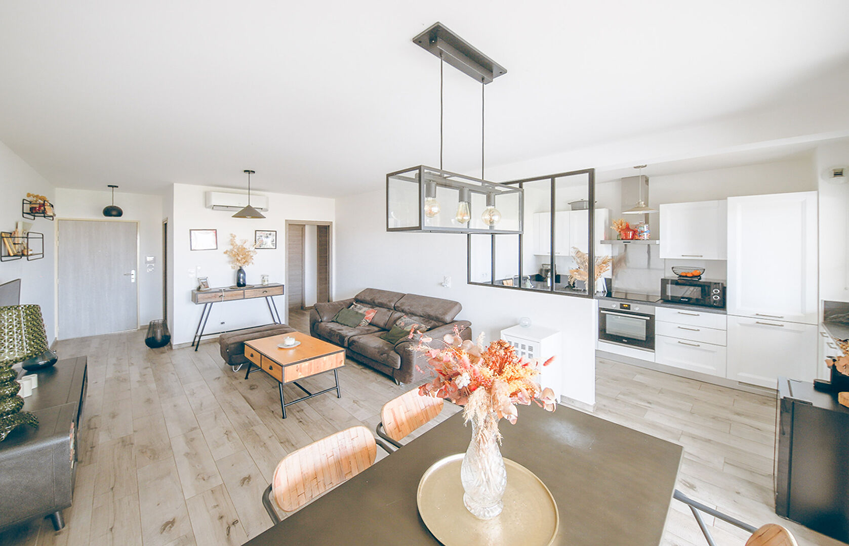 AGENCEMENT : Une entrée menant sur un salon lumineux avec baies vitrées s'ouvrant sur une grande terrasse, sur laquelle vous pourrez déjeuner au soleil, une cuisine semi ouverte moderne et pratique, qui s'intègre parfaitement à l'espace de vie.