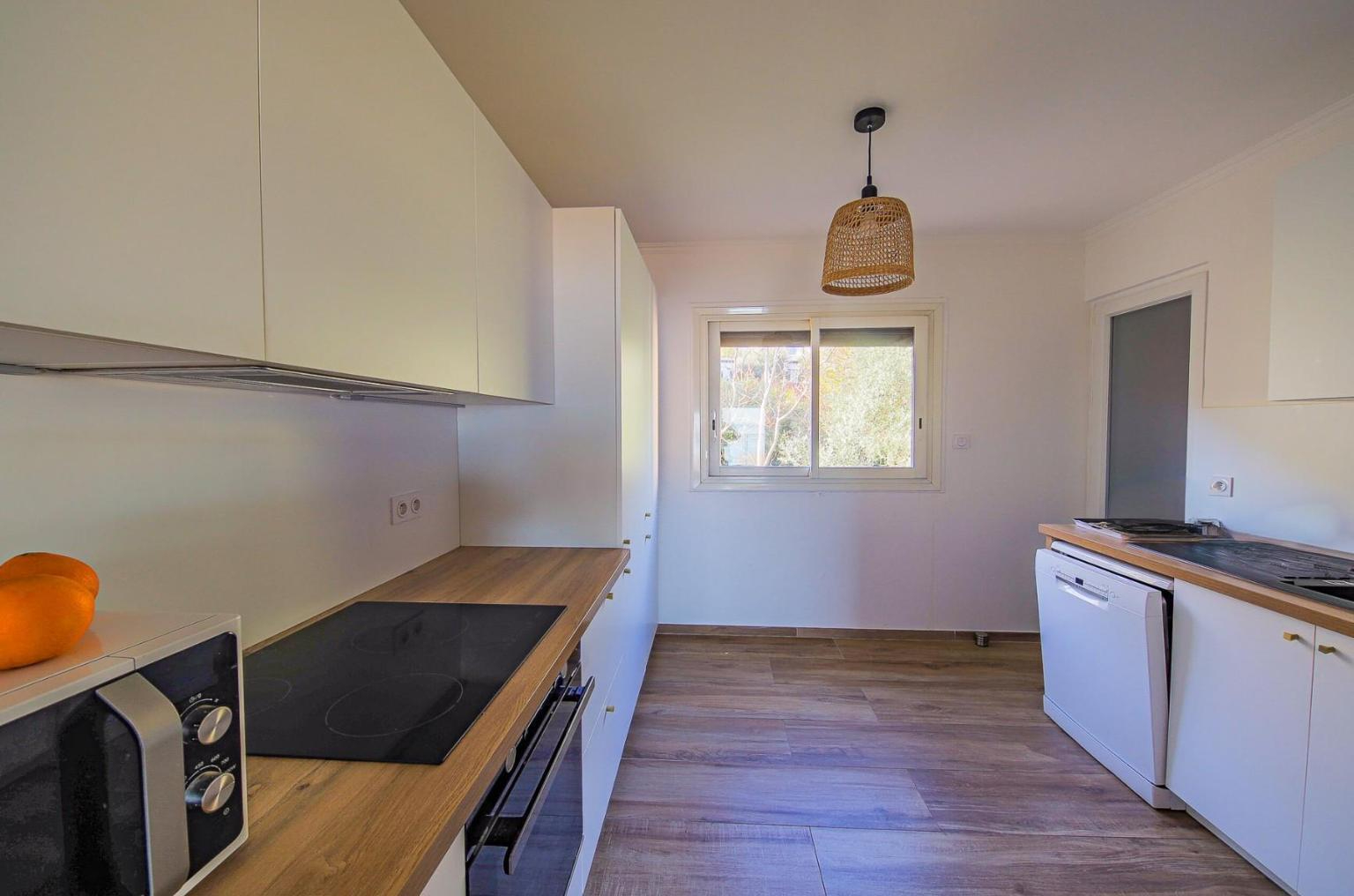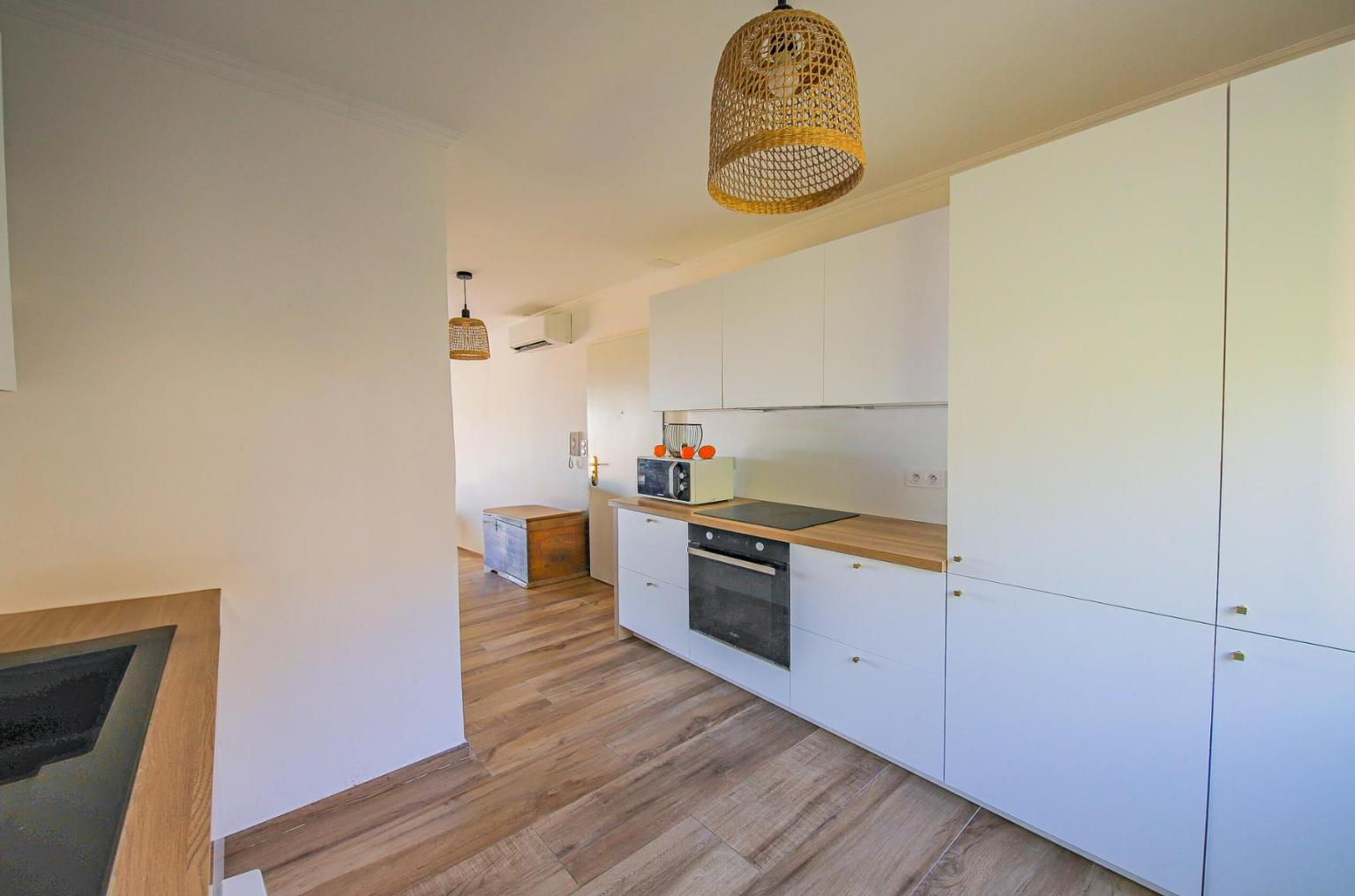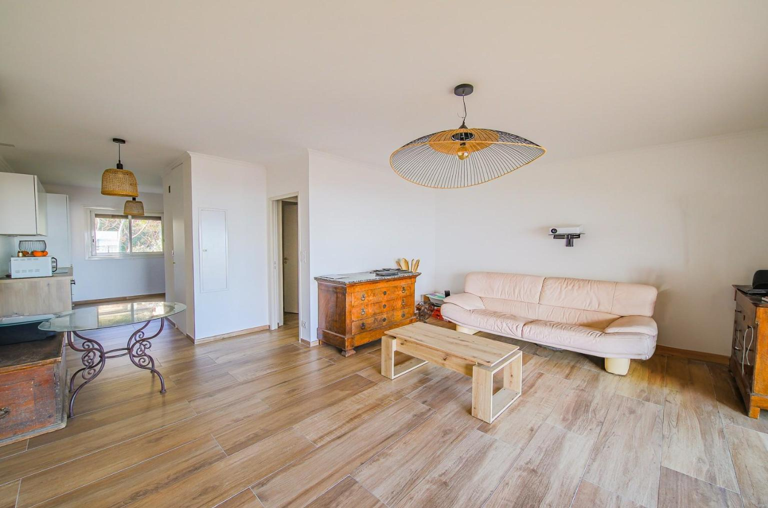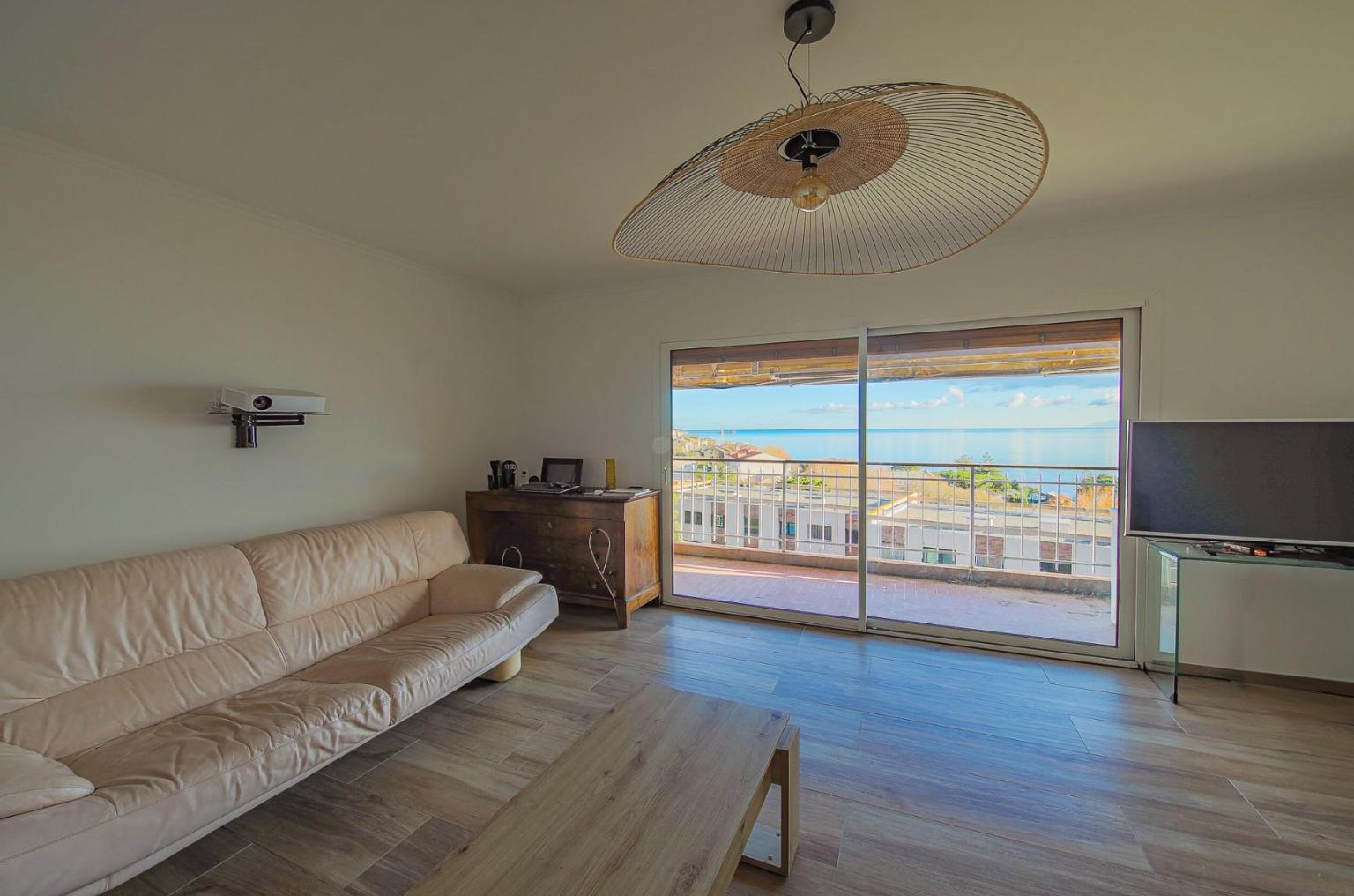 L'appartement se compose d'un salon lumineux avec cuisine ouverte, s'ouvrant sur la terrasse, un wc séparé, une salle de bain, ainsi que deux chambres, dont une avec vue mer.
