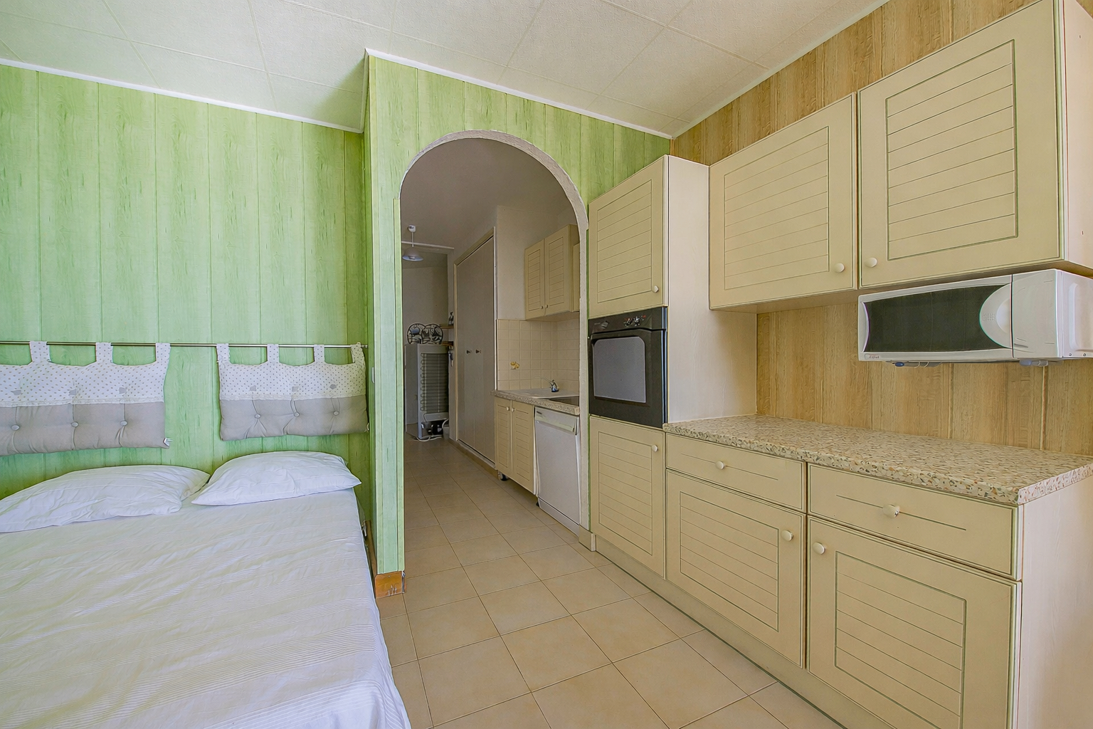 L'appartement se compose d'une entrée avec couloir desservant une salle d'eau avec wc, ainsi qu'une pièce principale avec cuisine ouverte sur le coin nuit, donnant accès à la terrasse avec vue mer.