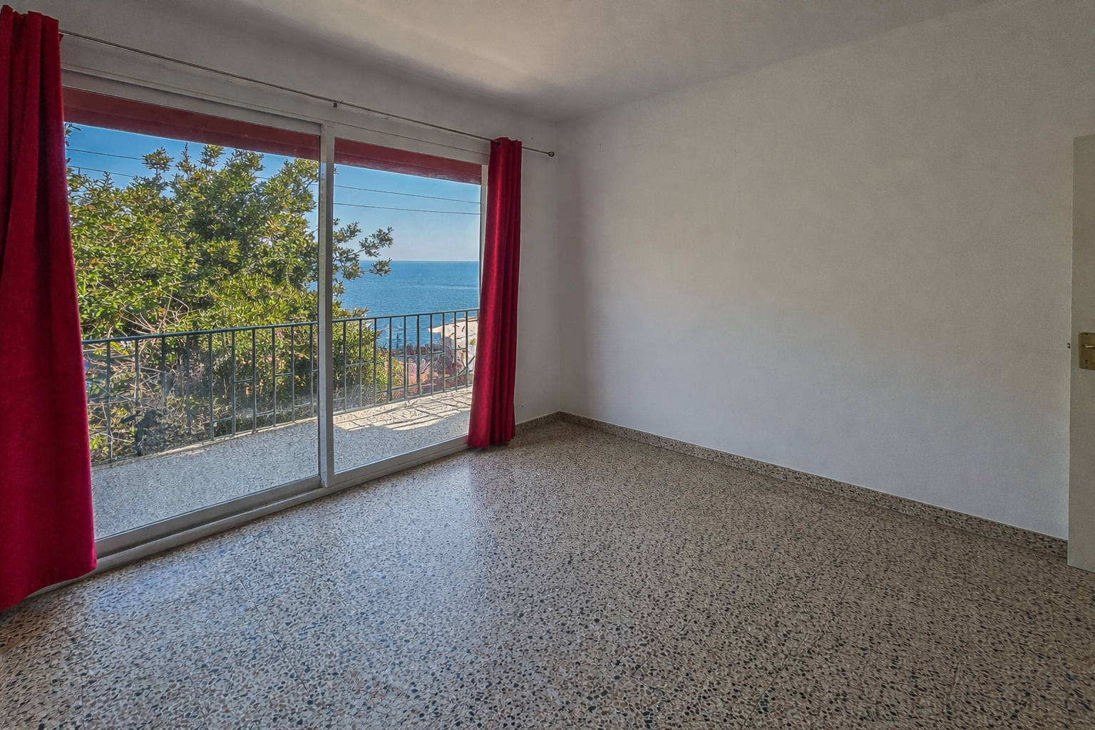 L'entrée principale dessert une cuisine et un séjour lumineux ouvrant sur un grand balcon avec vue imprenable sur la mer.
