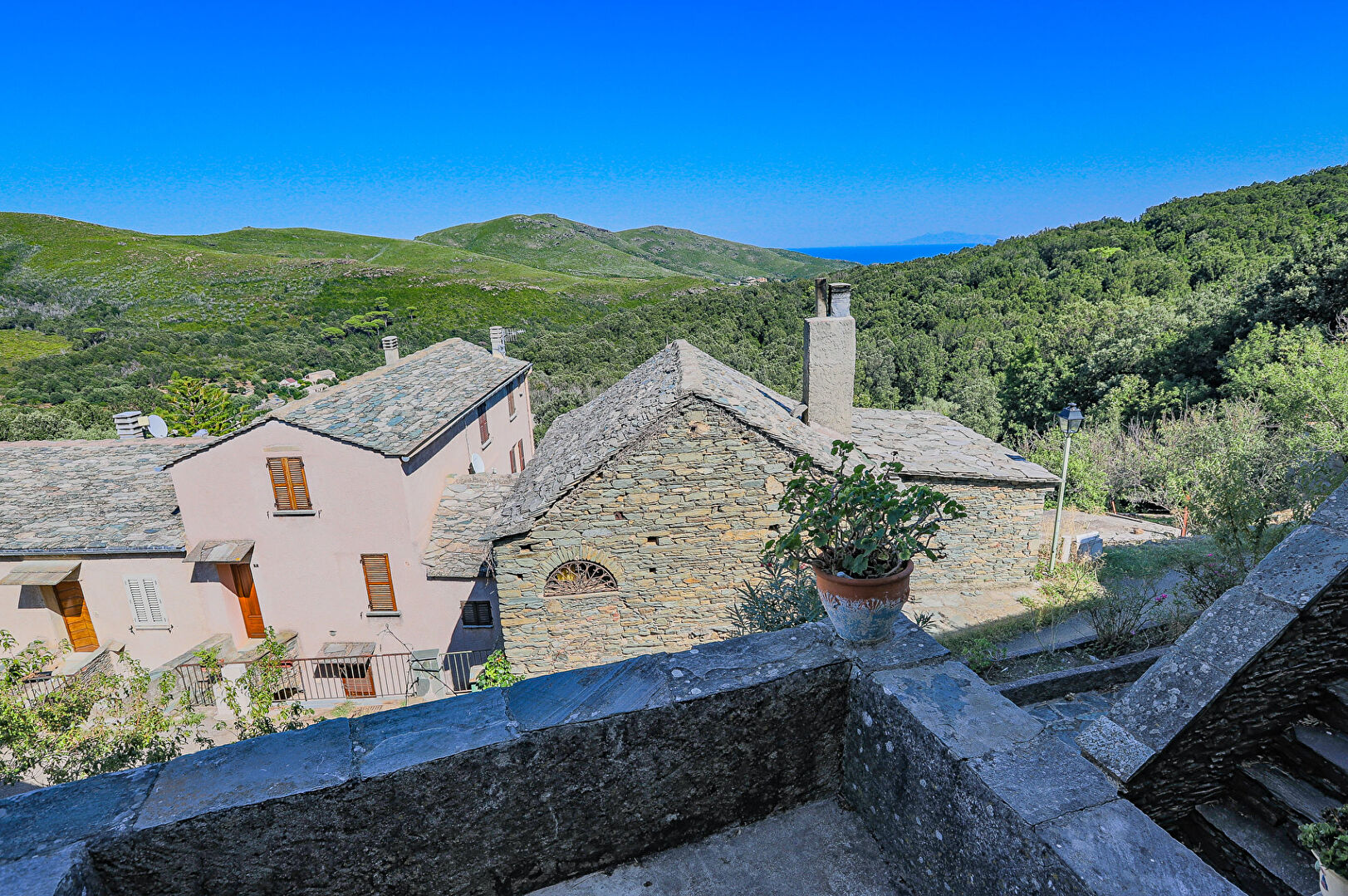 une cour vue montagne et mer au calme.