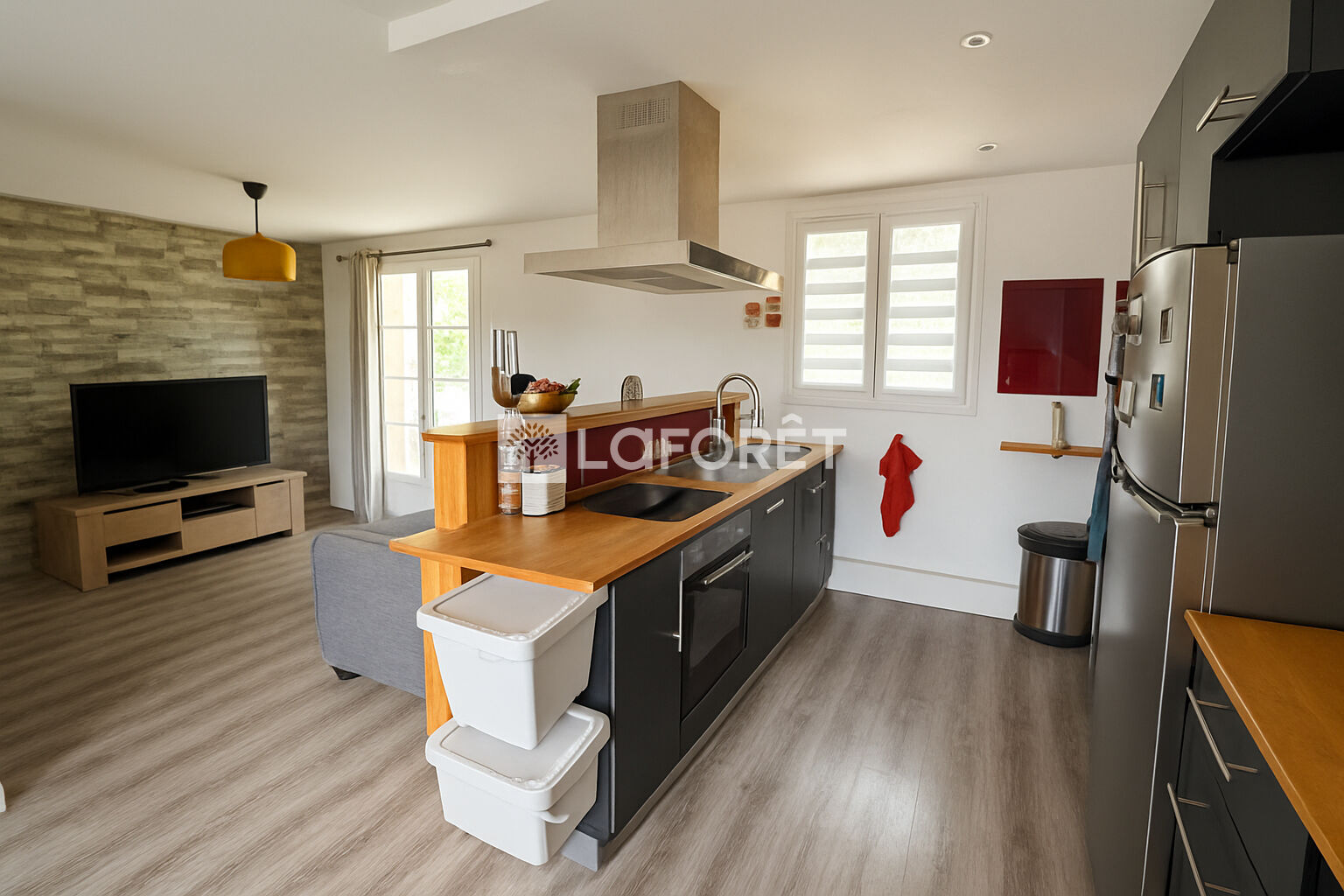 Il offre au rez-de-chaussée : une entrée, un séjour lumineux avec salle à manger et cuisine ouverte aménagée et équipée d'environ 29 m², ainsi qu'un WC indépendant.