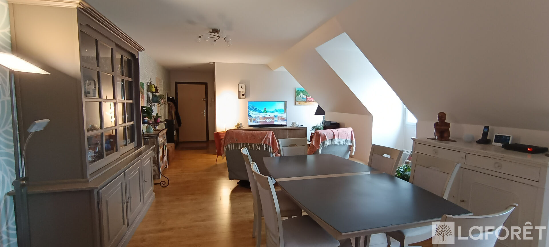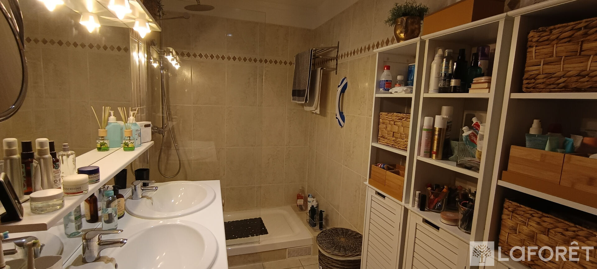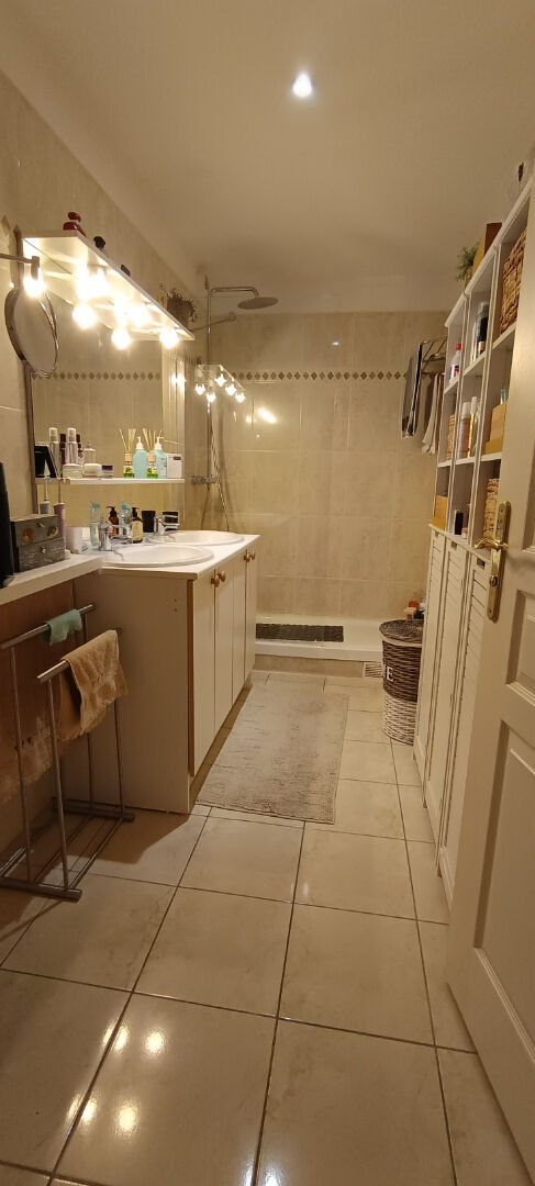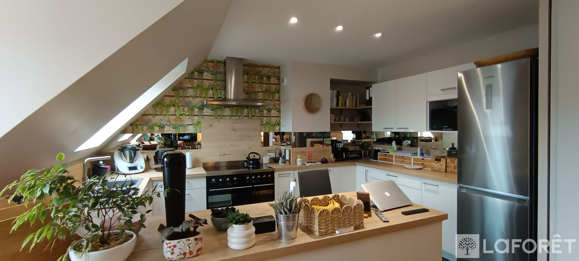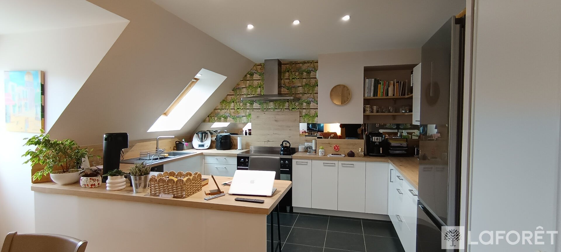Entrée, cuisine entièrement équipée récente GERARD DAVID ouverte sur salle salon d' une surface de 44m², 3 chambres, salle d'eau et wc.