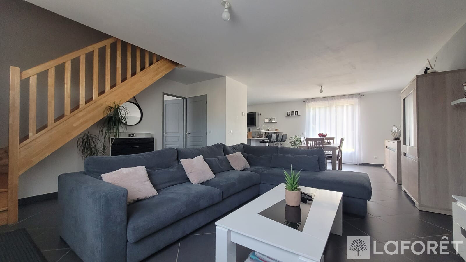 Vous entrez par une pièce de vie ouverte comprenant un salon, une salle à manger et une cuisine équipée et aménagée.
