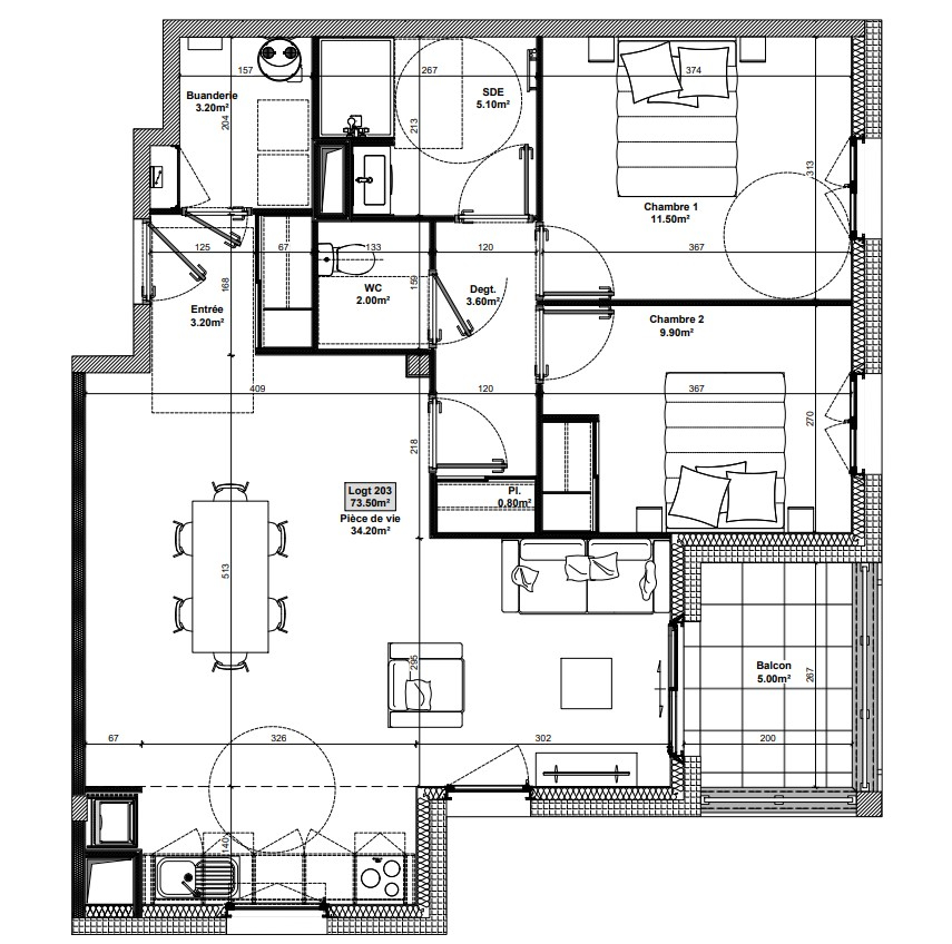 Un appartement typeT3 au 2eme étage, d'une superficie d'environ 73.6 m² composé d'une cuisine ouverte sur salon-séjour, de 2 chambres, salle d'eau d'une buanderie et d'un WC.