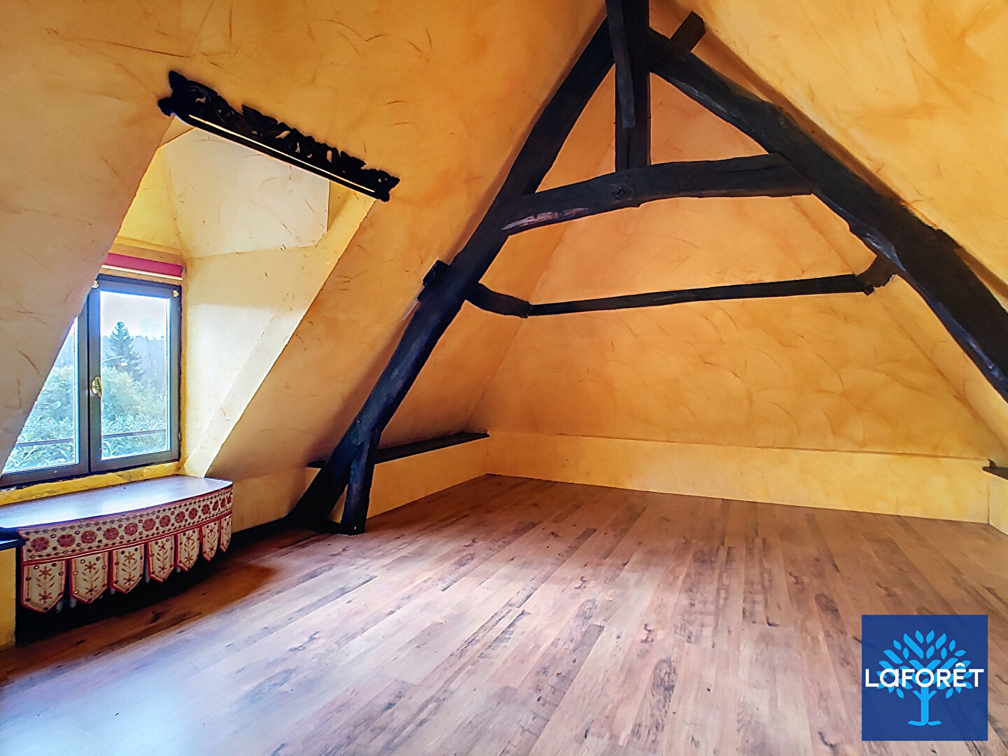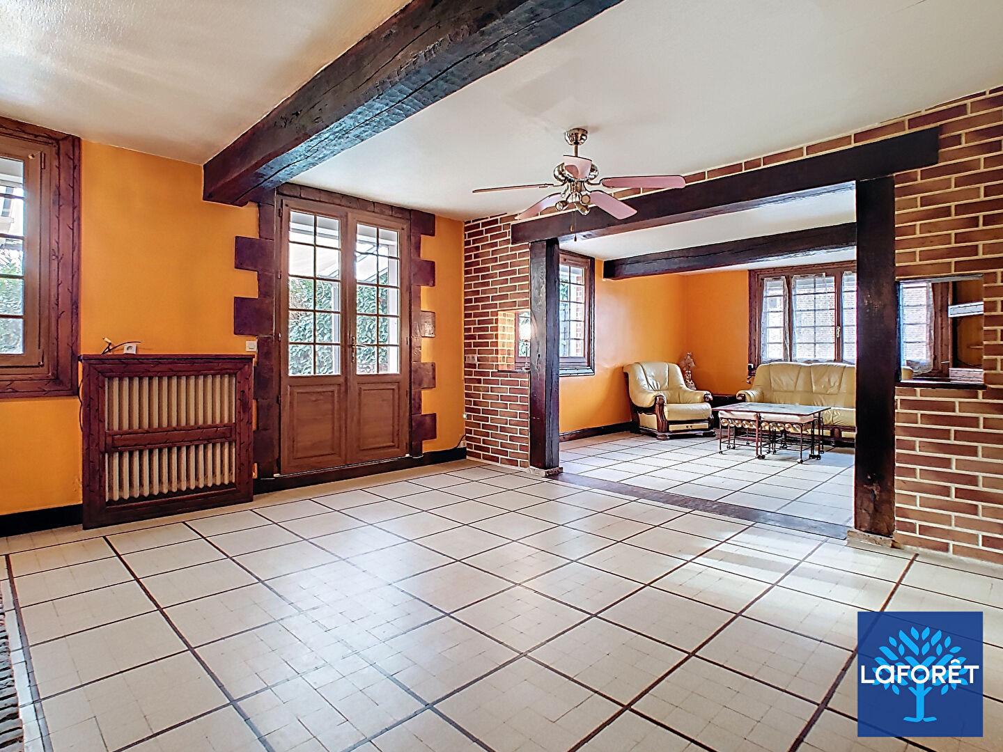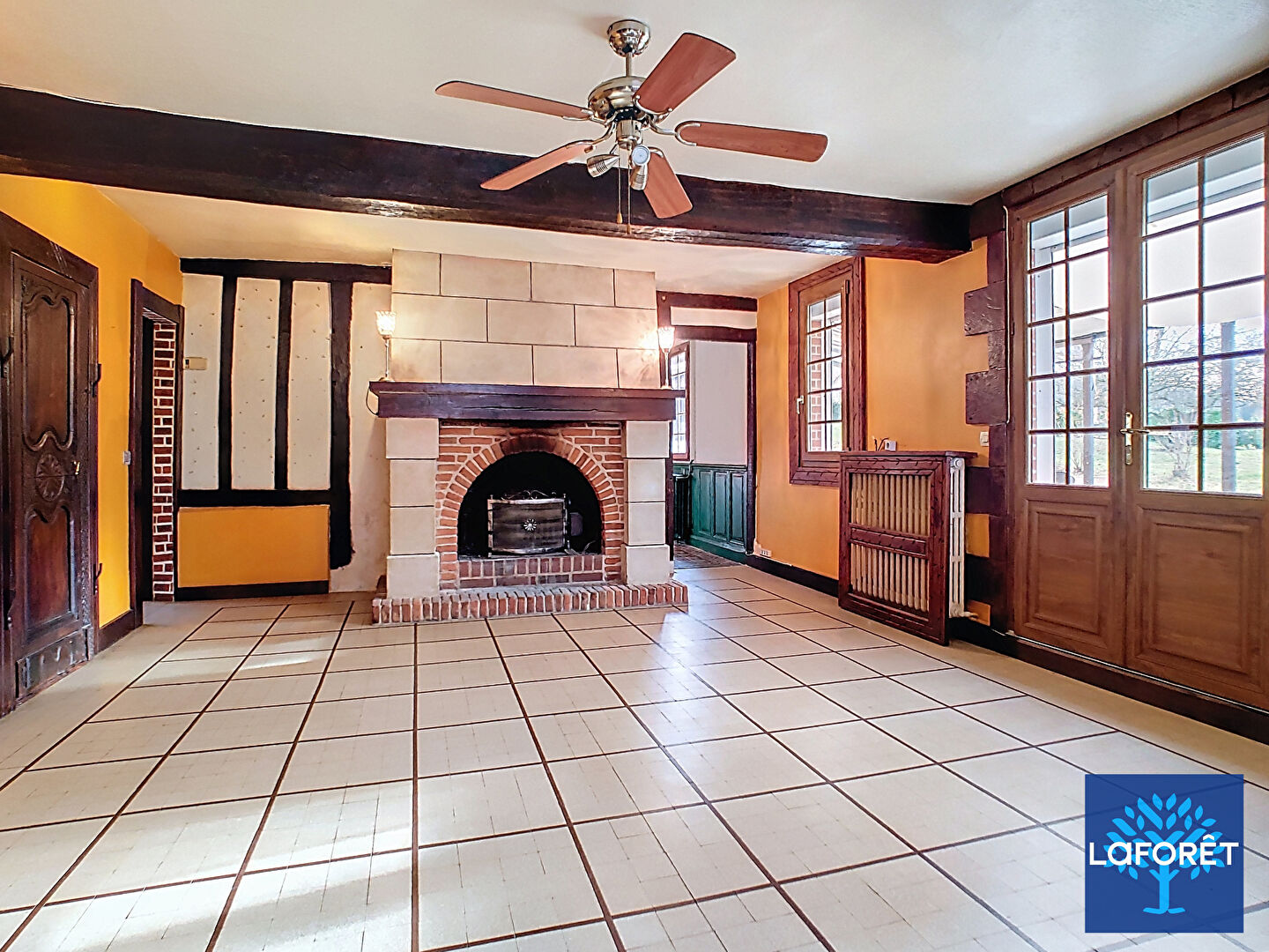 Maison normande comprenant une entrée, un vaste séjour avec cheminée ouverte, un salon avec cheminée, une cuisine équipée, une chambre avec salle d'eau et wc, et une buanderie avec wc. A l'étage, une pièce palière, une chambre et une salle de bains avec wc.
