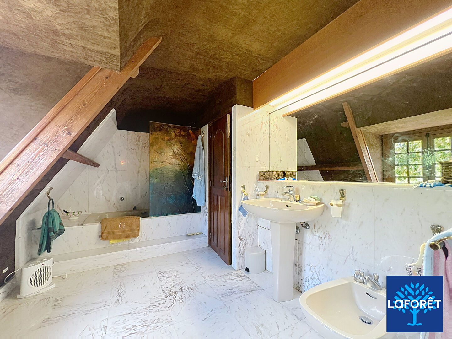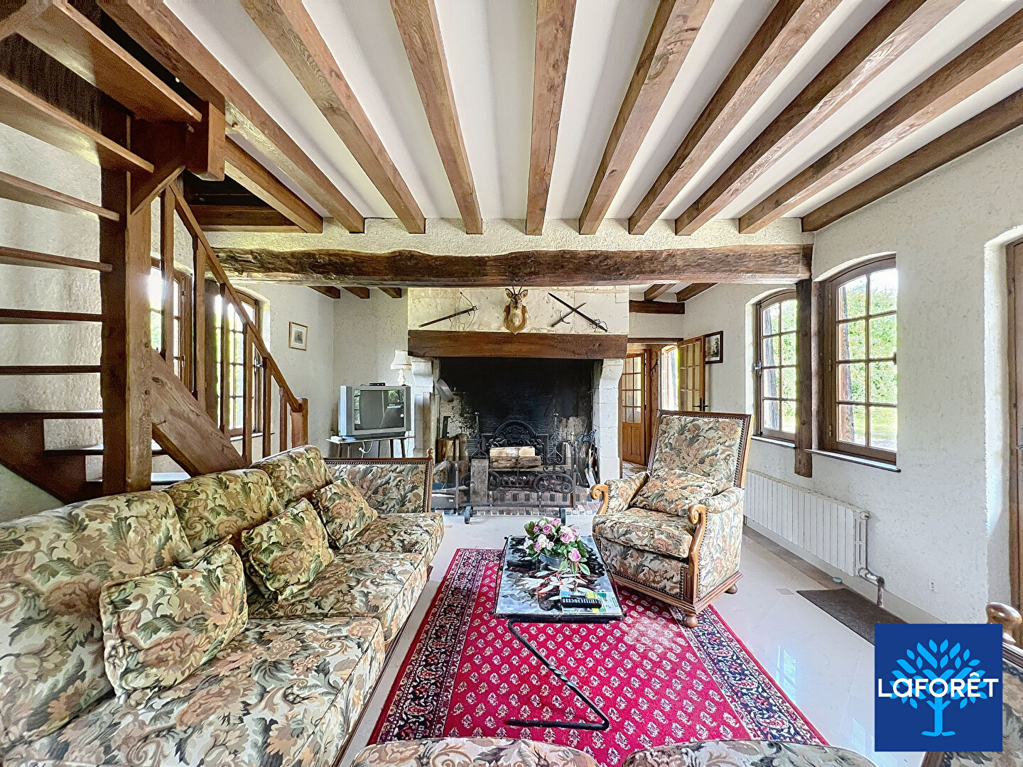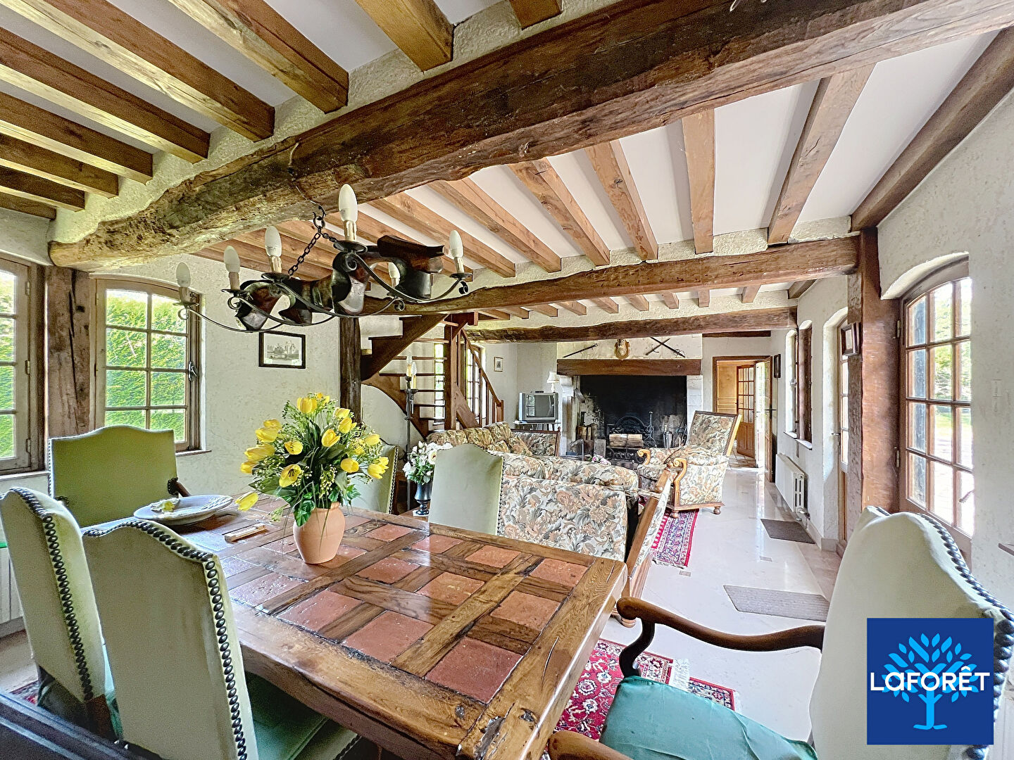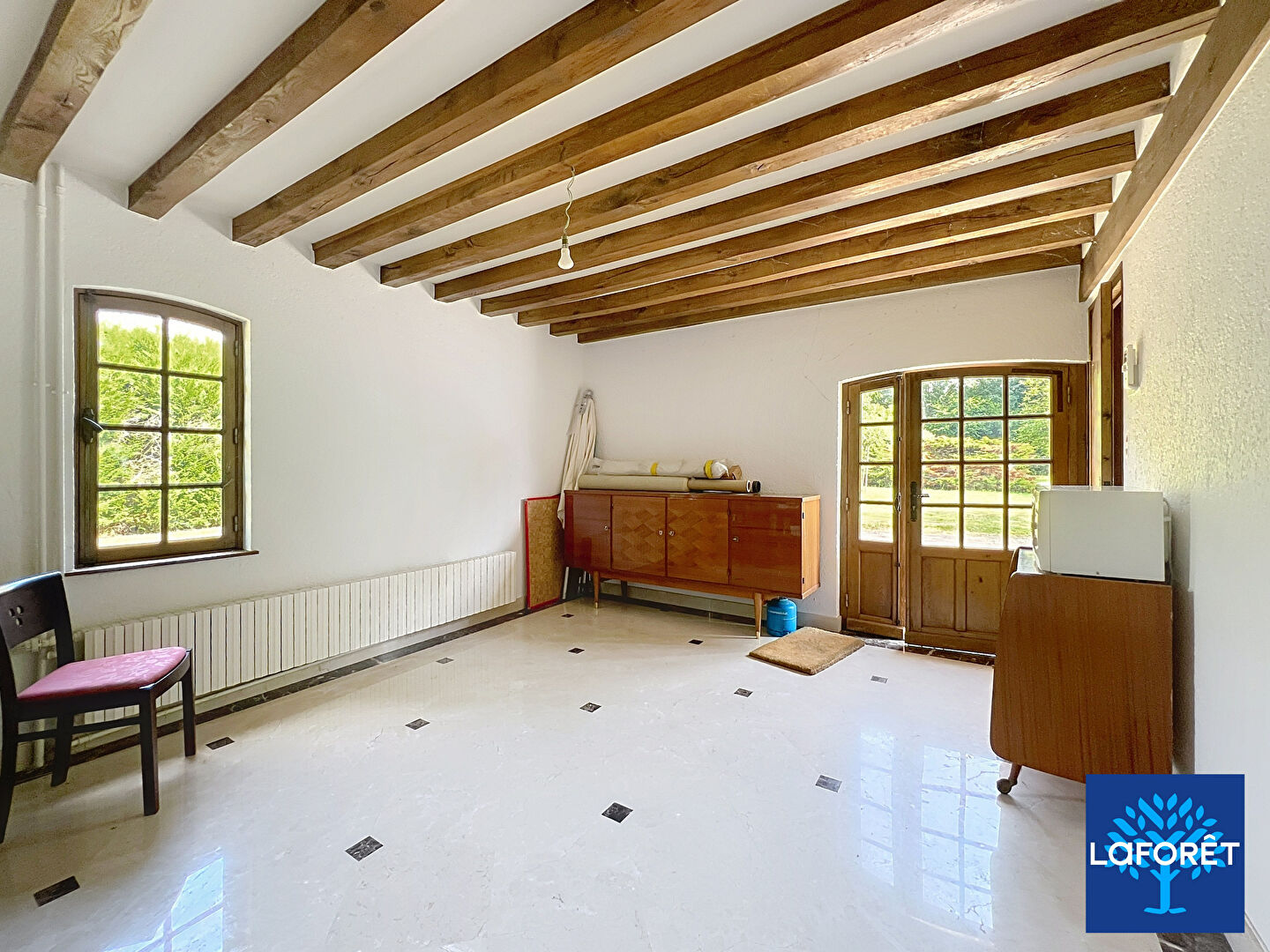 - Au rez-de-chaussée : un vaste séjour avec une cheminée à foyer ouvert, une cuisine, une chambre avec la possibilité de créer une salle d'eau, une entrée, un wc, un débarras et une chaufferie.