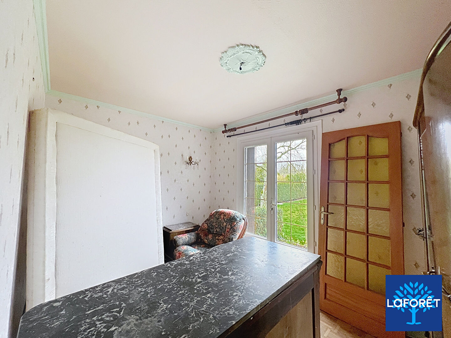 - Au rez-de-chaussée : entrée, séjour, cuisine, deux chambres, salle de bains, et wc indépendant.