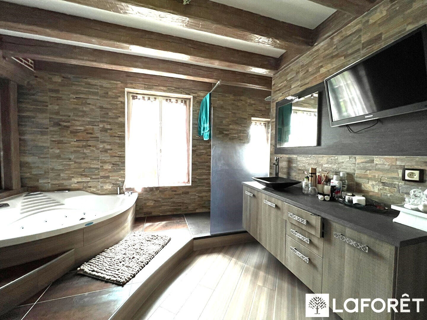- Un Manoir Normand avec une spacieuse entrée qui distribue, une véranda, un petit salon avec cheminée, une cuisine aménagée et équipée, un double séjour avec cheminée, une grande chambre avec salle de bains et dressing.